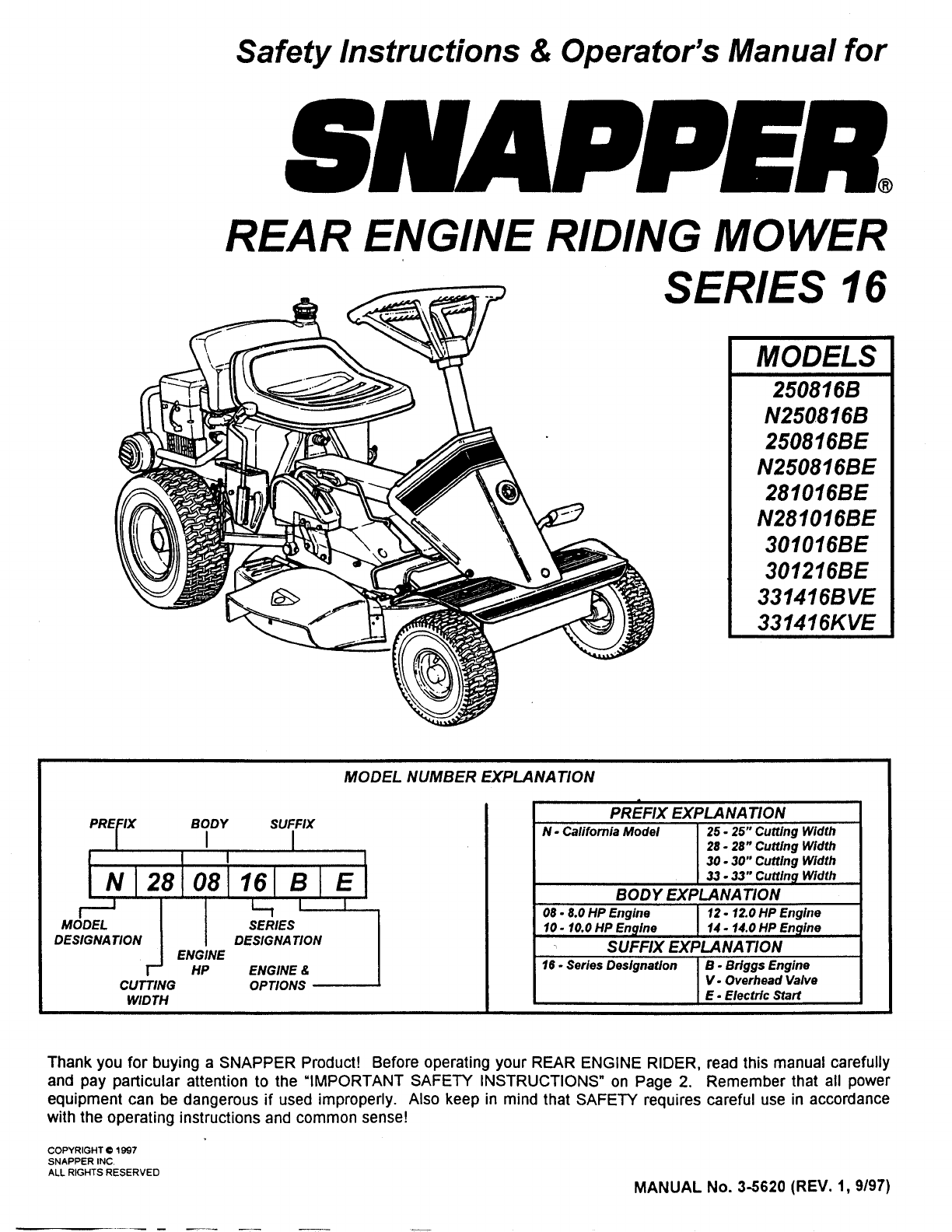 Thank you for buying a SNAPPER Product! Before operating your REAR ENGINE RIDER, read this manual carefully