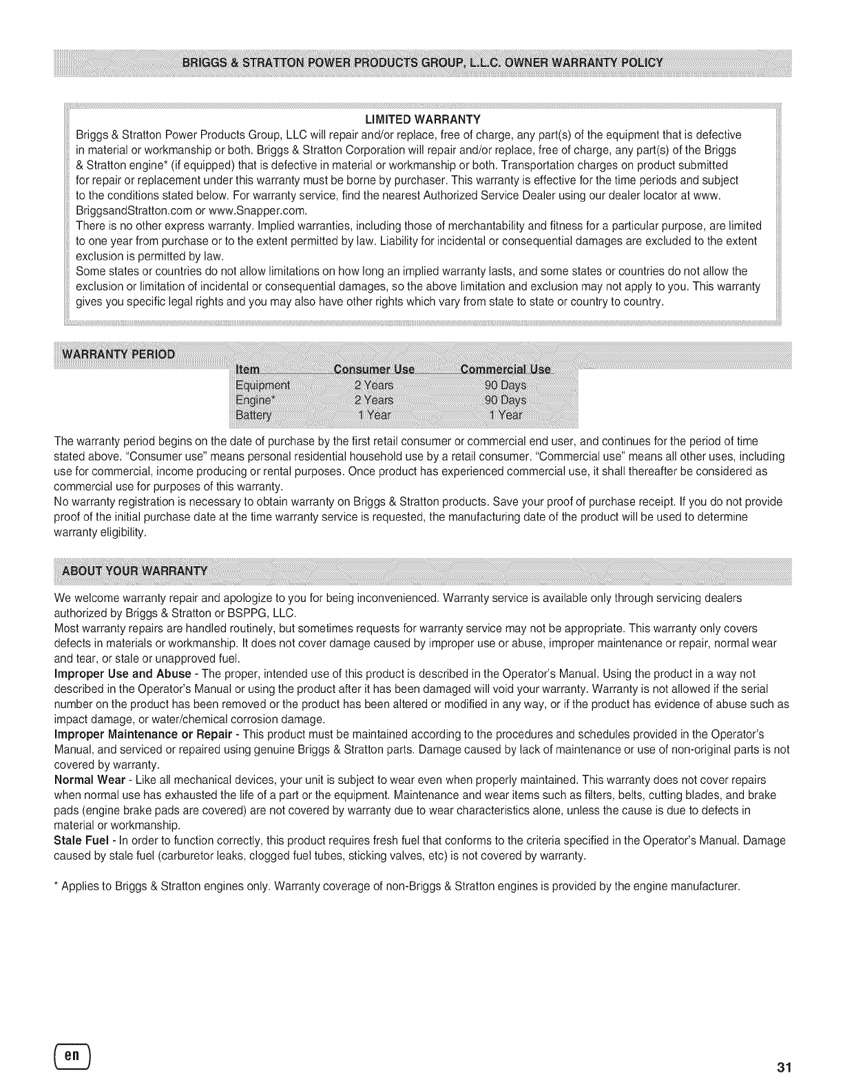 * Estosolo se aplica a los motores de Briggs & Stratton. La cobertura de la garantia de los motores no fabricados por Briggs & Stratton la ofrece el