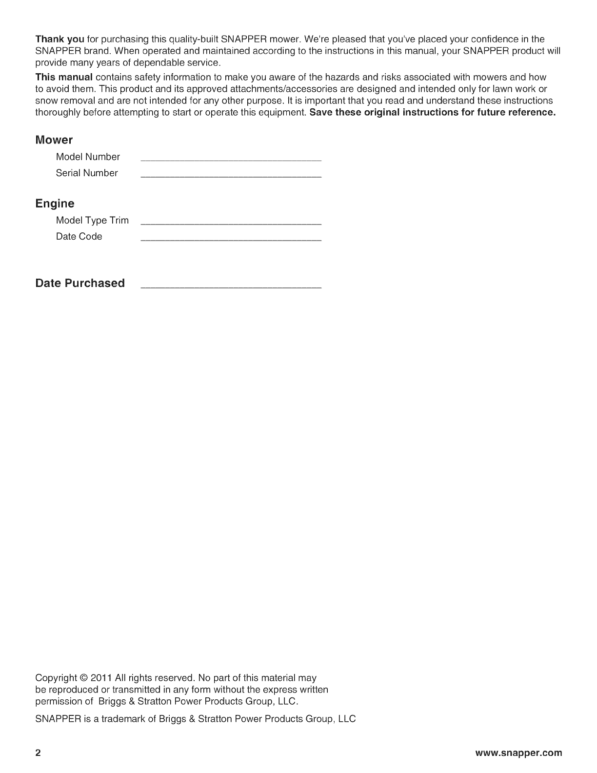 Thankyouforpurchasingthisquality-builtSNAPPERmower.We'repleasedthatyou'veplacedyourconfidenceinthe