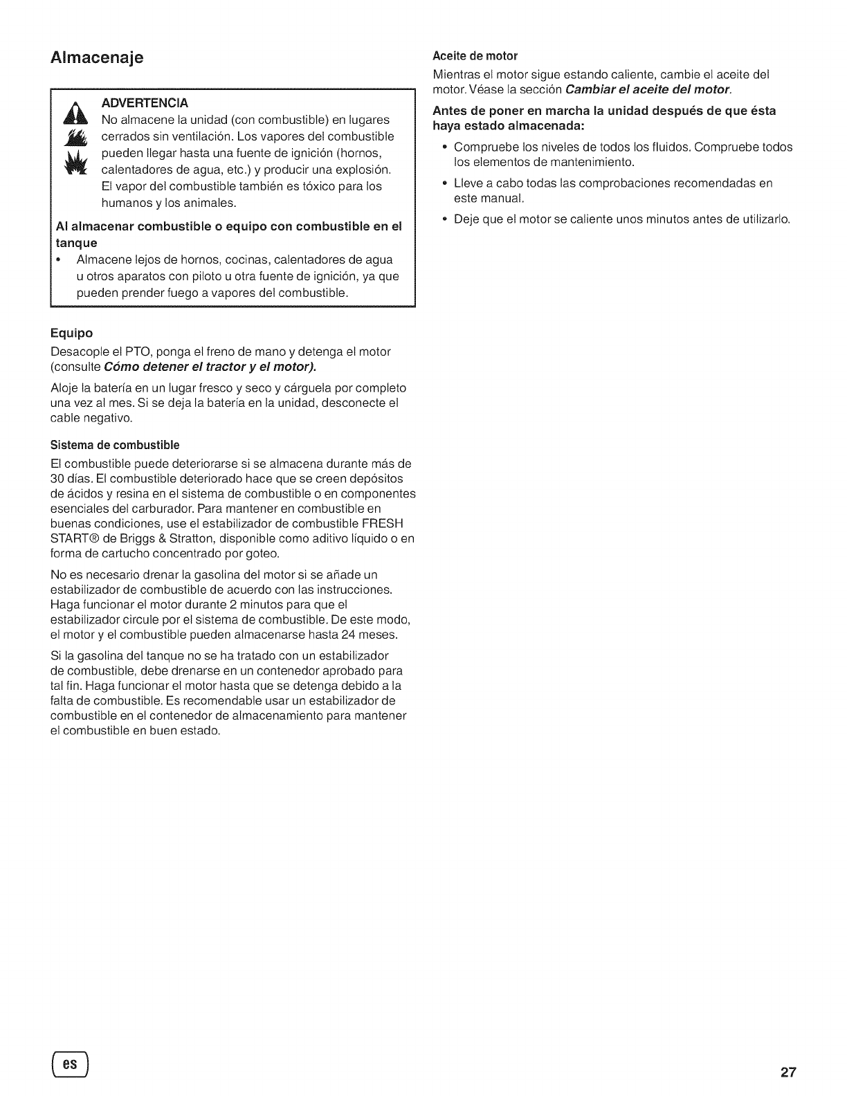 especificados en el manual del usuario. Losda_os ocasionados por el combustible viejo (en mal estado), como fugas en el carburador, tubos de