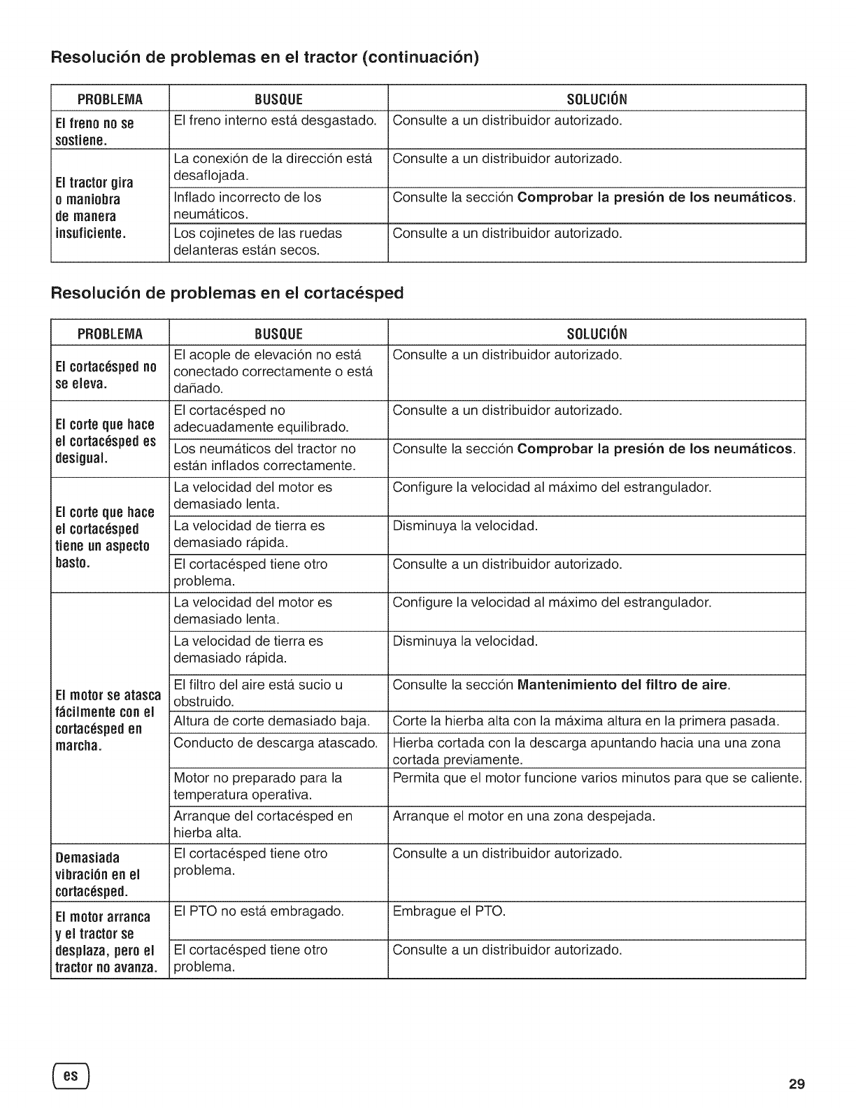desgaste y que deben someterse a programas de mantenimiento tales como los filtros, la correas, las cuchillas de corte y las zapatas del freno