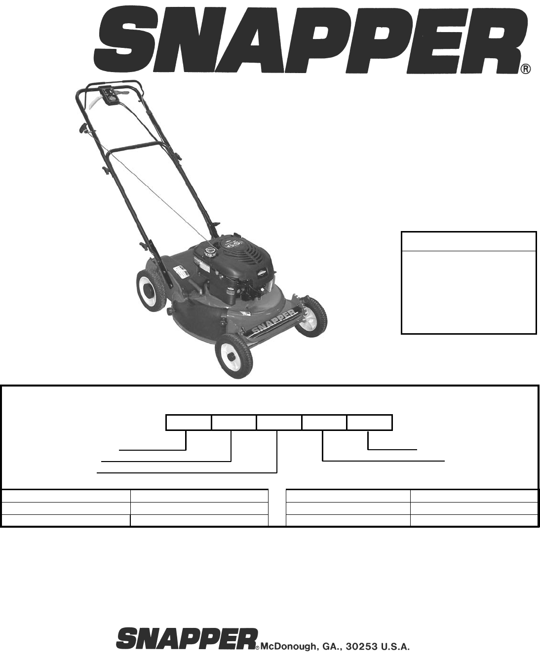 Snapper’s Product Registration Center, P.O. Box 1379, McDonough, Georgia 30253