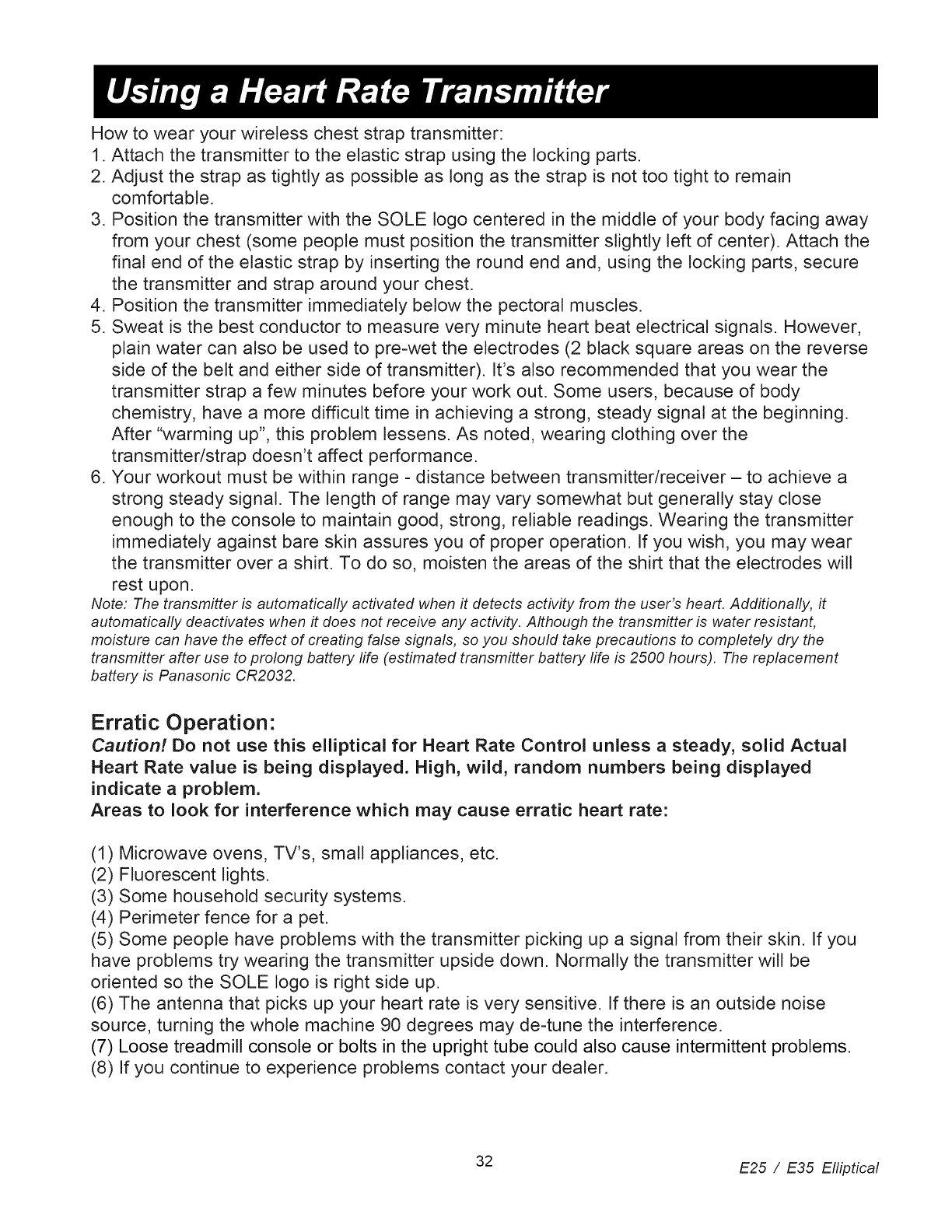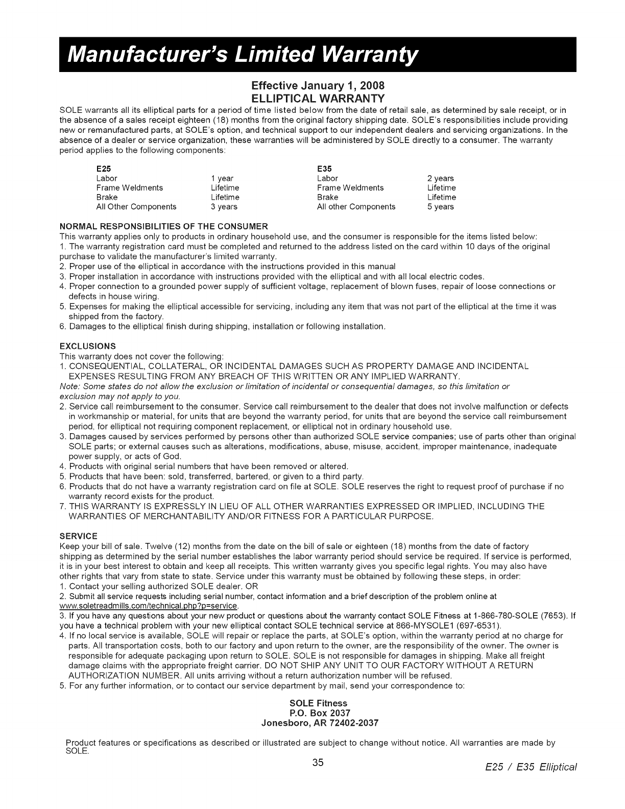 Sole E25 2010 User Manual ELLIPTICAL MANUF THRU MAY Manuals And Guides 1008145L