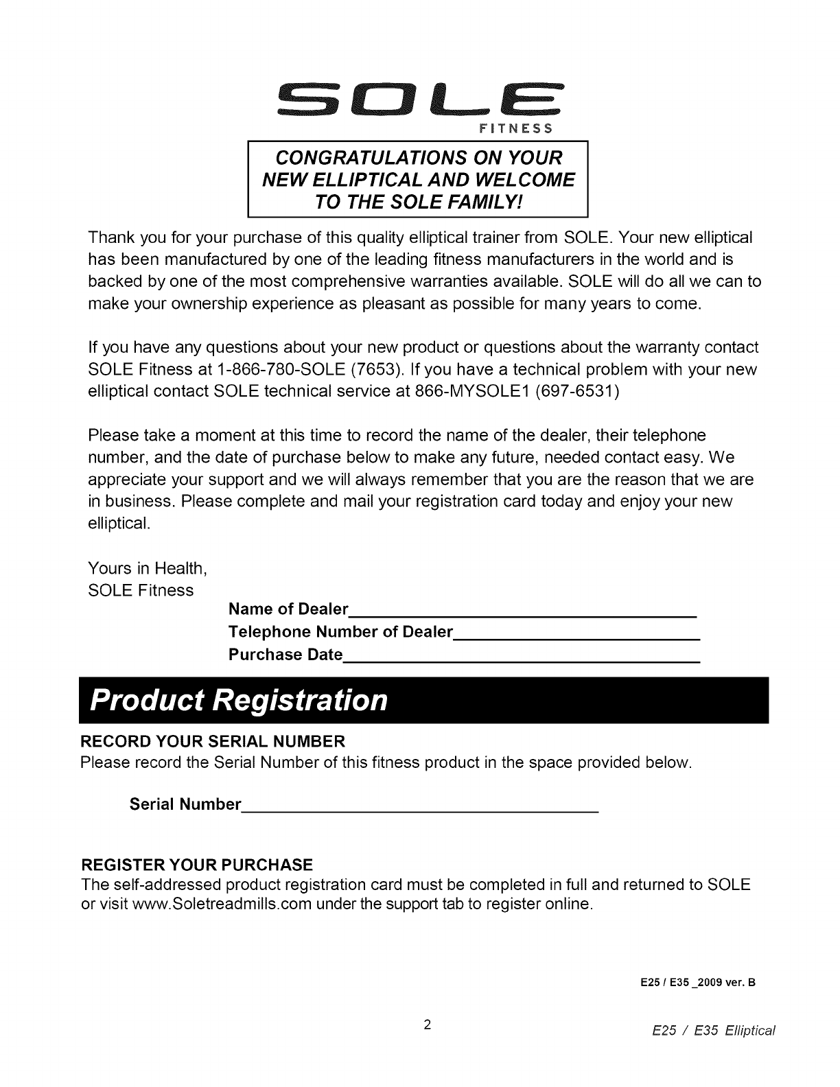 SOLE Fitness at 1-866-780-SOLE (7653). If you have a technical problem with your new