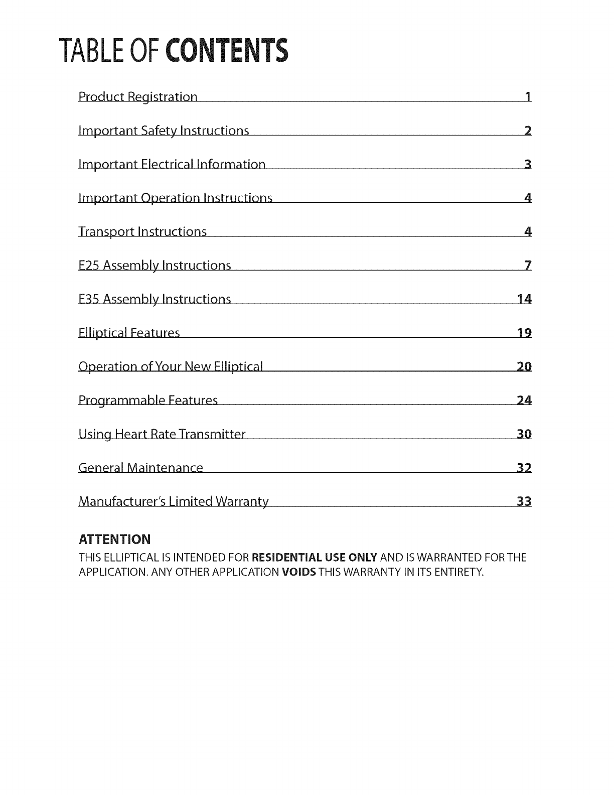 THIS ELLIPTICAL IS INTENDED FOR RESIDENTIAL USE ONLY AND IS WARRANTED FOR THE