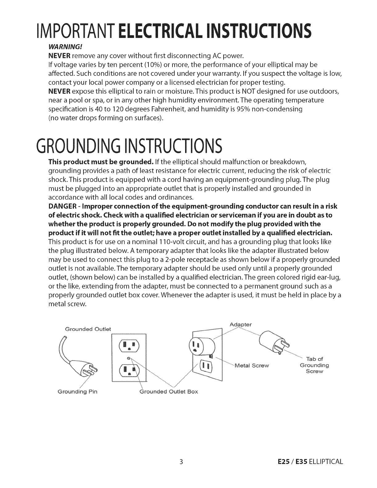 3. Proper installation in accordance with instructions provided with the elliptical and with all local electric codes.