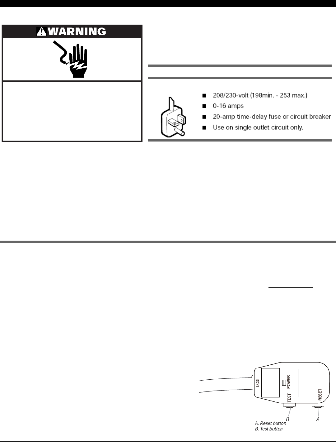 • The power supply cord must be replaced if it fails to trip when the TEST button is pressed and the unit fails to reset.