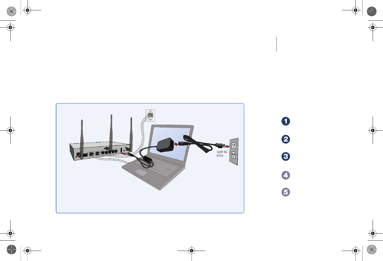 Connect the included power cable and adaptor and plug into a properly grounded 120V AC outlet.