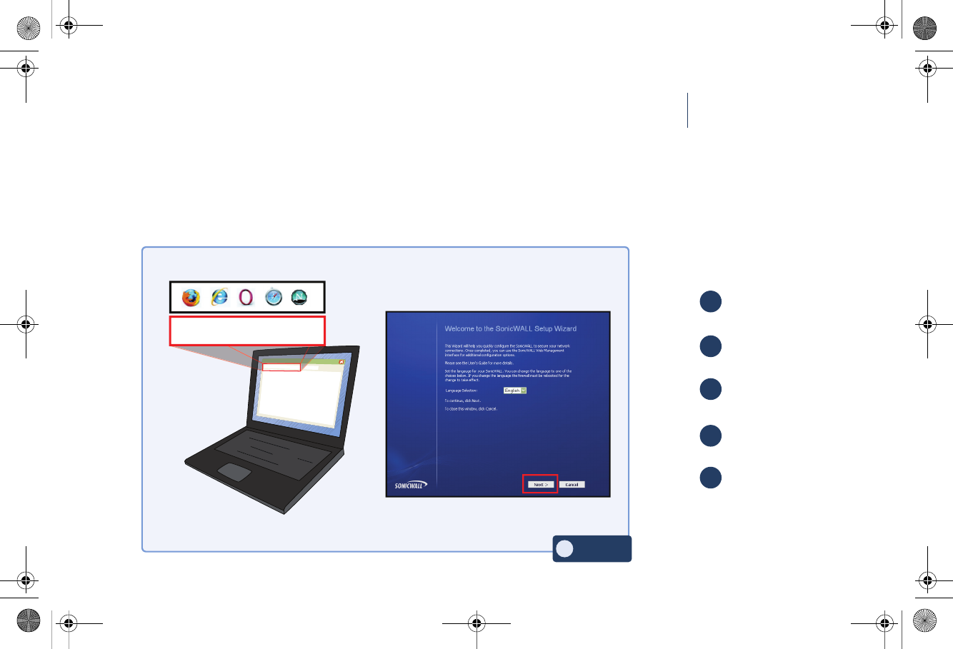 “http://192.168.168.168/” in a Web browser. The SonicWALL Setup Wizard displays.