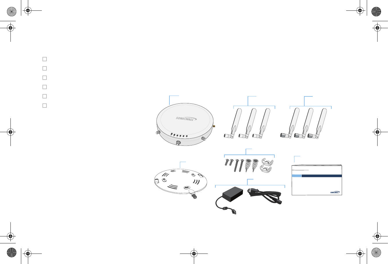 Before continuing, ensure that your SonicPoint package contains the following materials: