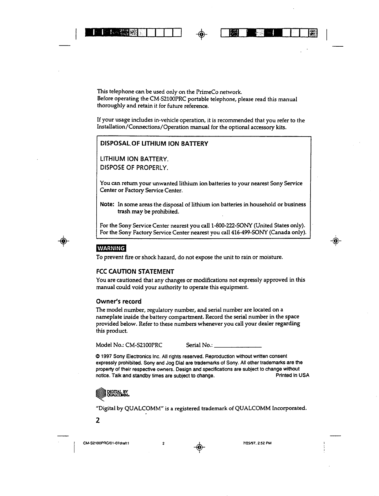 Sony Electronics CMSB2 Single-Band PCS CDMA Phone User Manual Replacement Users Manual
