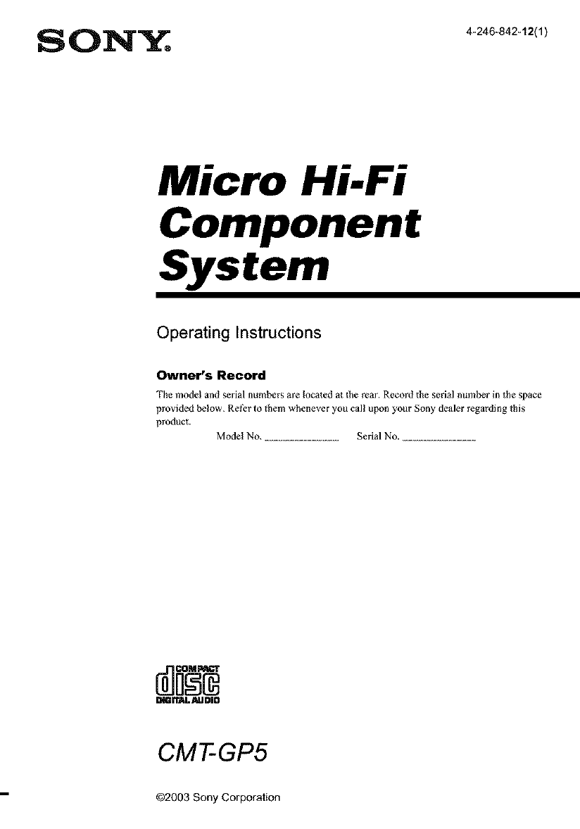 User Manual: Sony CMT-GP5 CMT-GP5 SONY HI FI COMPONENT SYSTEM - Manuals and Guides View the owners manual for your SONY HI FI COMPONENT SYSTEM #CMTGP5. Home:Electronics Parts:Sony Parts:Sony HI FI COMPONENT SYSTEM Manual
