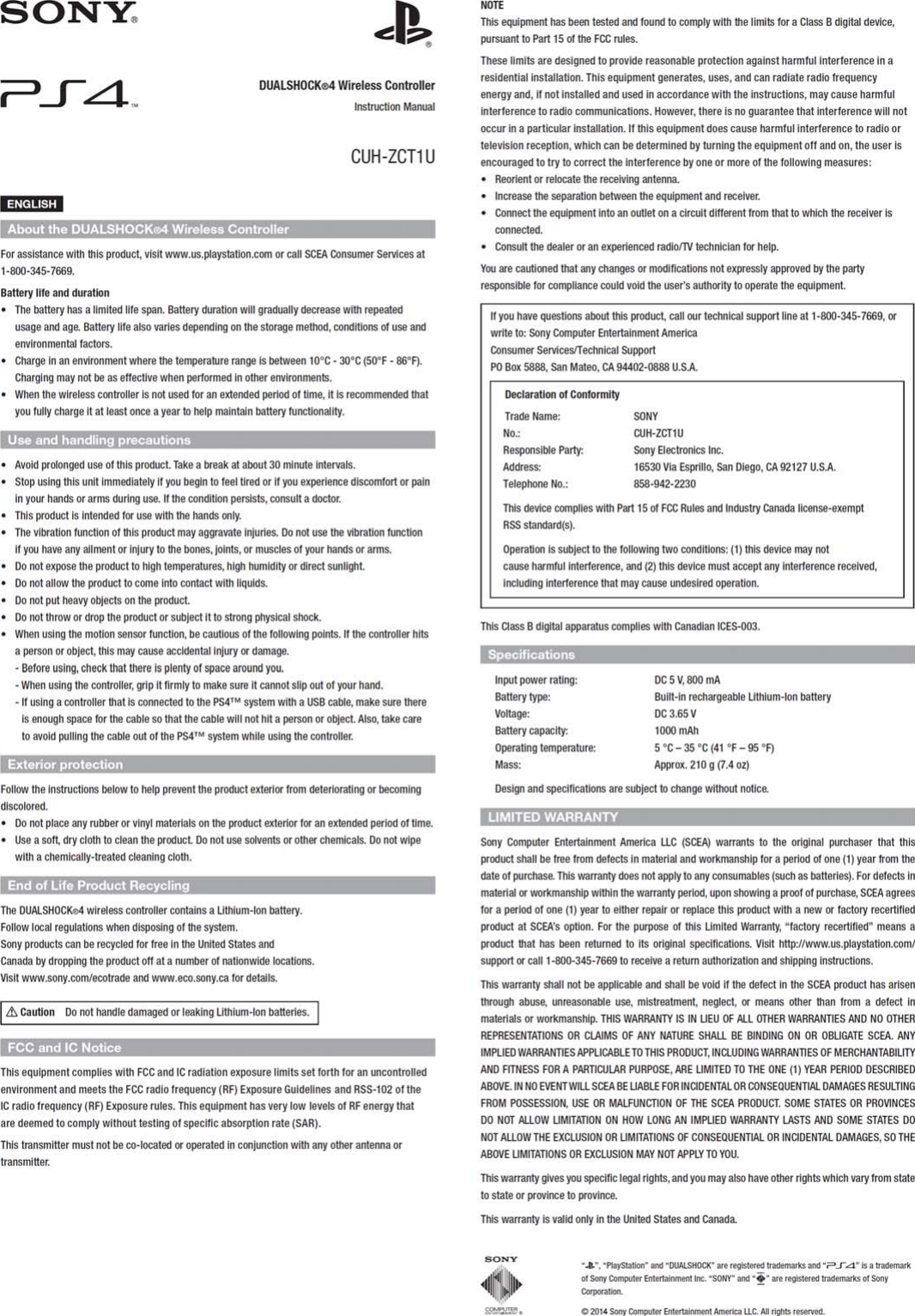 Sony CUHZCT1F1 Wireless Controller User Manual Short Term Confidential