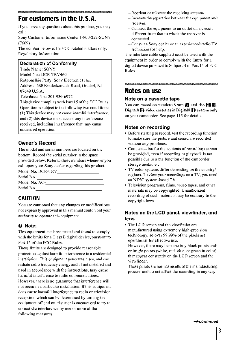 Sony Customer futbrmation Cemcr 1-800-222-SONY