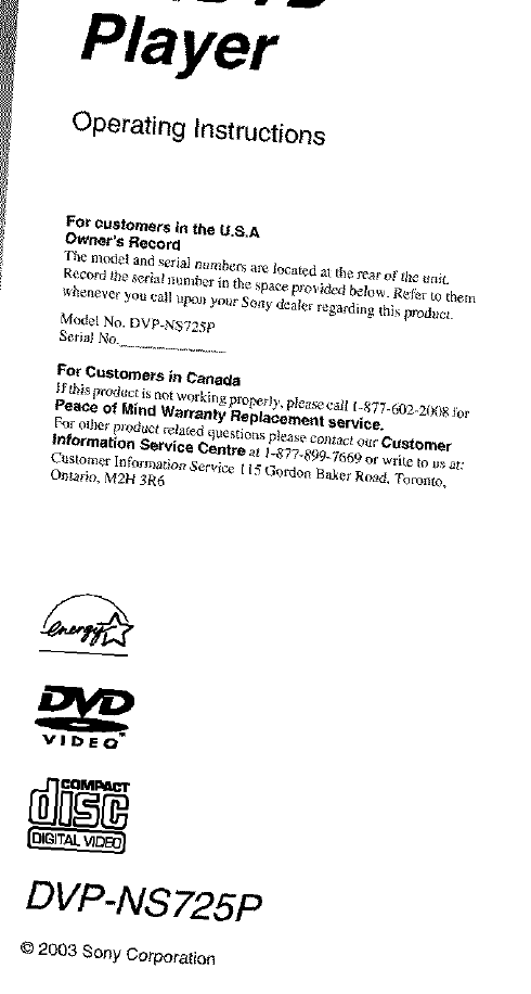 Sony DVP NS725P User Manual CD/DVD PLAYER Manuals And Guides L0307116
