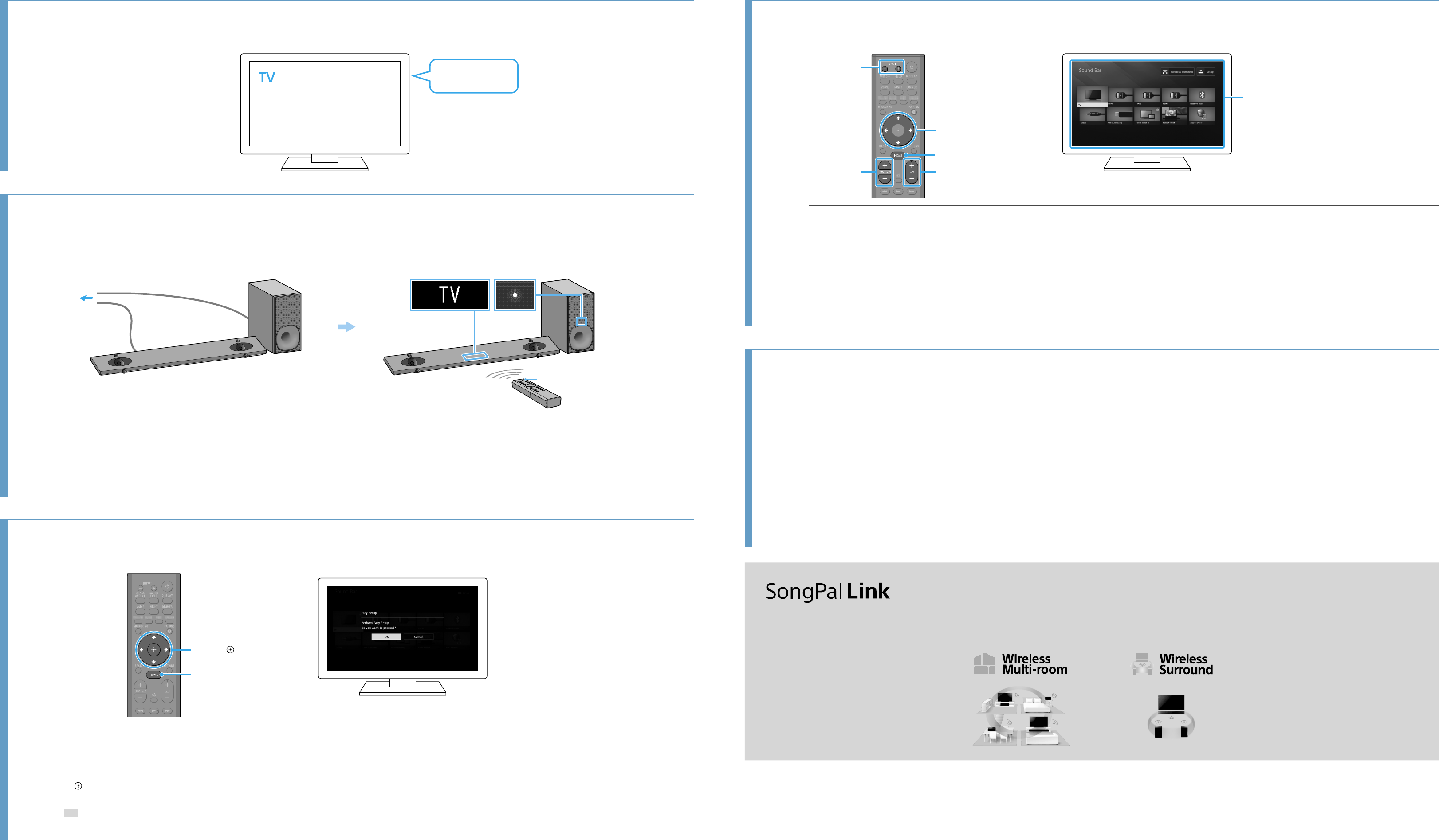 •When the Bar Speaker obstructs the remote control sensor of the TV, the TV remote control may not work. In that case, set [IR-Repeater] to [On]. You can control the TV with the remote control of the TV. For details, refer to “Sending the