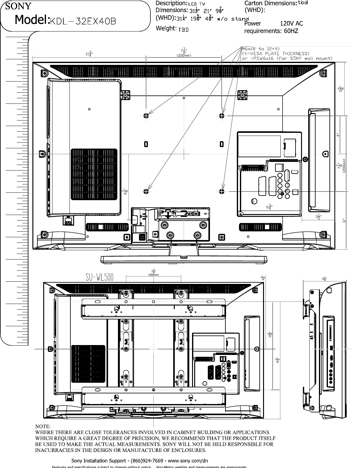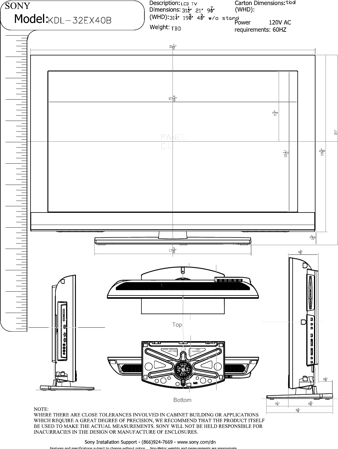 Sony KDL 32EX40B Layout1 User Manual Dimensions Diagram KDL32EX40B Cutsheet