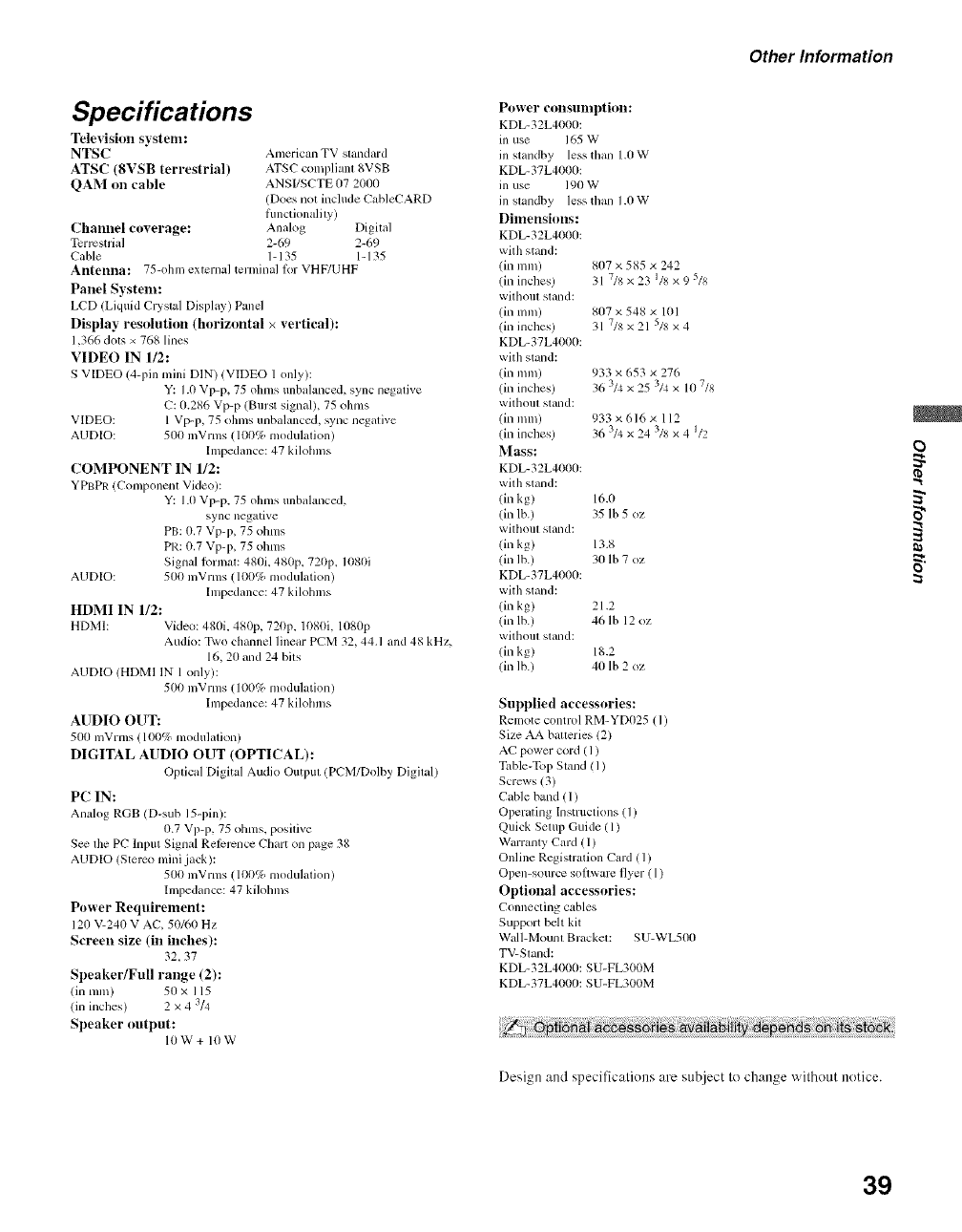 Model: KDL- 32L4000/KDL- 37 L4000