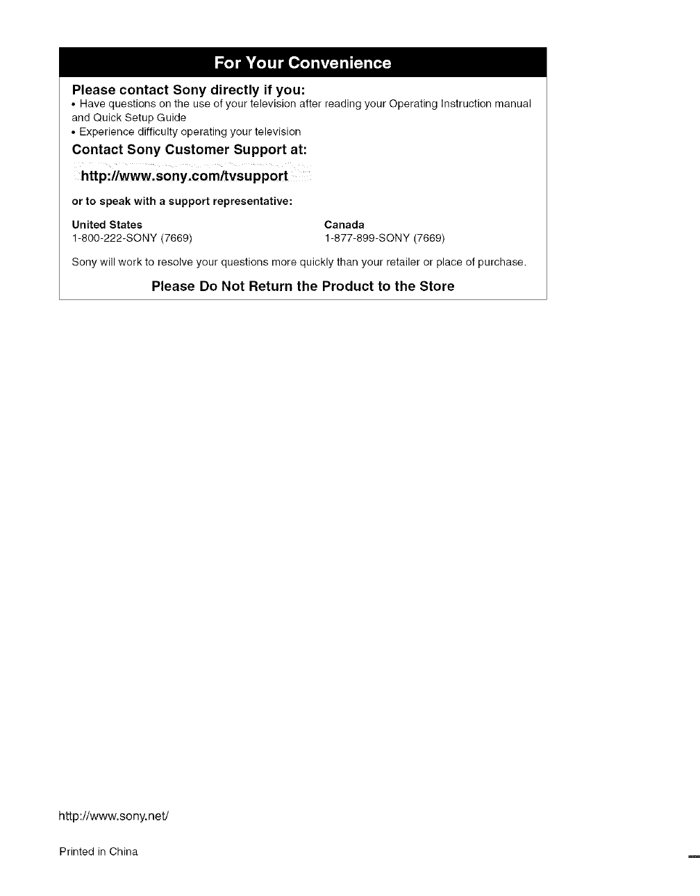 Sony will work to resolve your questions more quickly than your retailer or place of purchase.