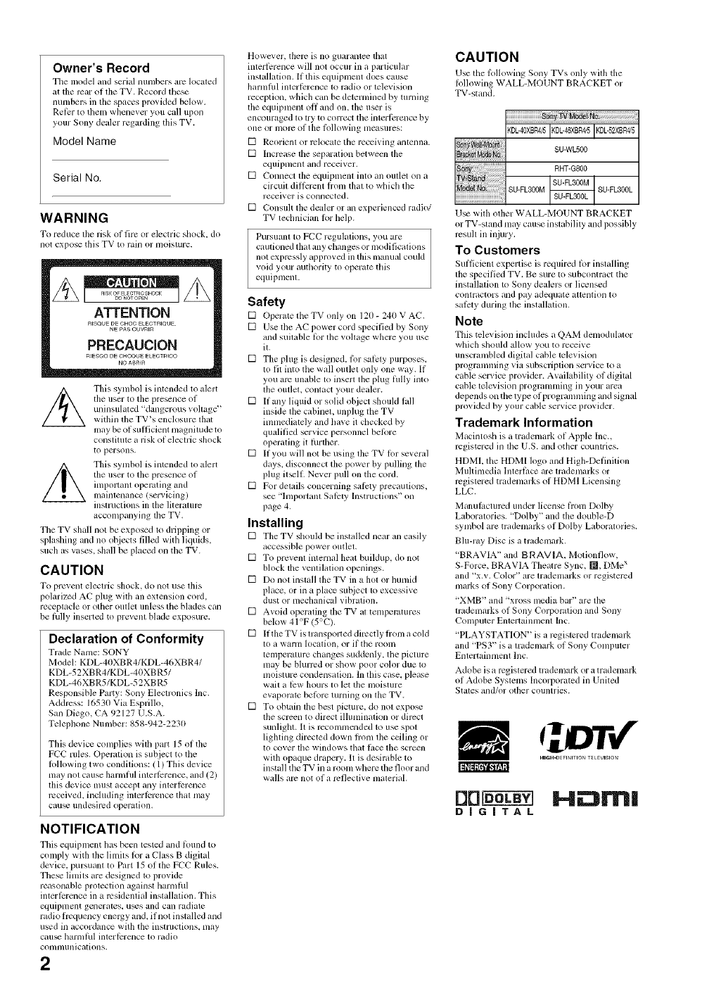 SONY LCD Television Manual LR708011 SONY LCD Television Owner's Manual, SONY LCD Television installation guides