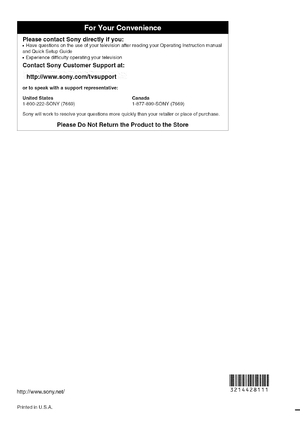 1-800-222-SONY (7669) 1-877-899-SONY (7669)