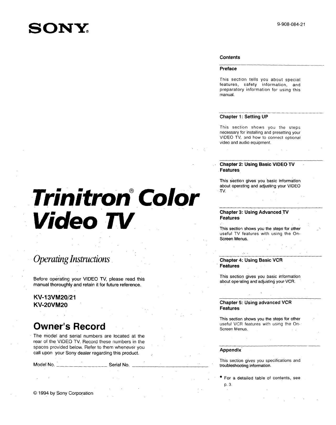 User Manual: Sony KV-13VM20 KV-13VM20 SONY TRINITRON COLOR TELEVISION - Manuals and Guides View the owners manual for your SONY TRINITRON COLOR TELEVISION #KV13VM20. Home:Electronics Parts:Sony Parts:Sony TRINITRON COLOR TELEVISION Manual