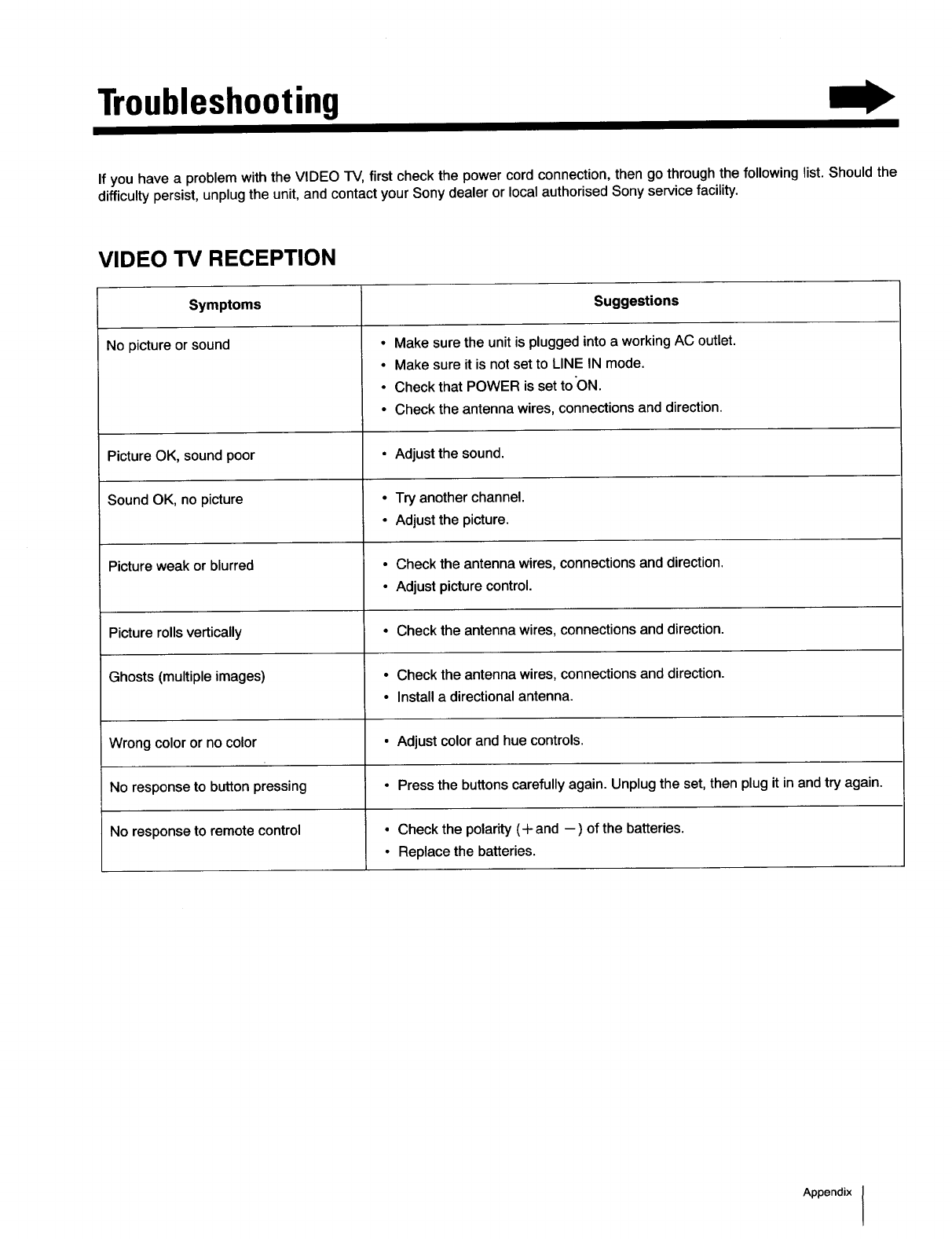 If you have a problem with the VIDEO TV, first check the power cord connection, then go through the following list. Should the