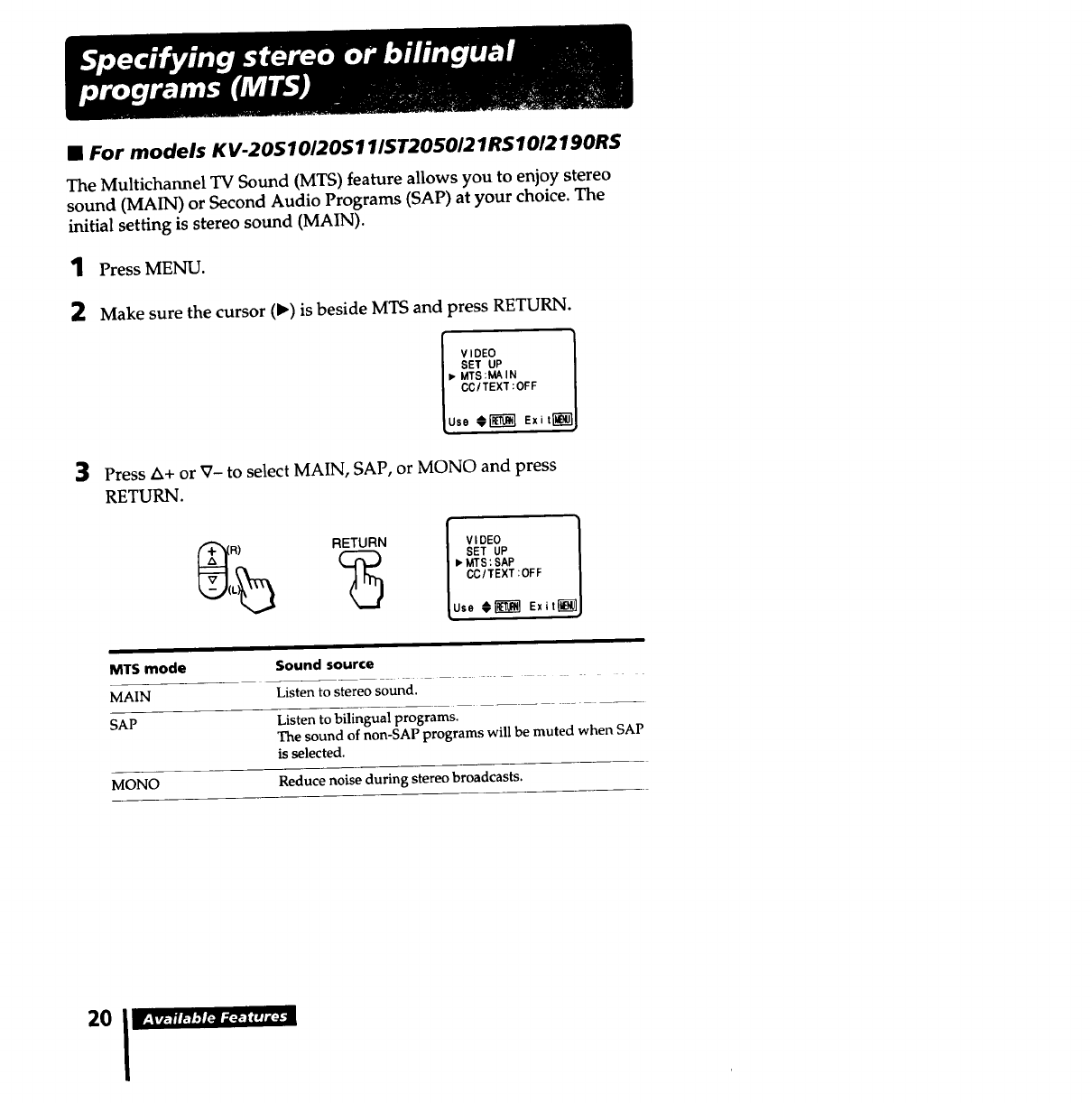 User Manual: Sony KV-20M10 KV-20M10 SONY TRINITRON COLOR TELEVISIOIN - Manuals and Guides View the owners manual for your SONY TRINITRON COLOR TELEVISIOIN #KV20M10. Home:Electronics Parts:Sony Parts:Sony TRINITRON COLOR TELEVISIOIN Manual
