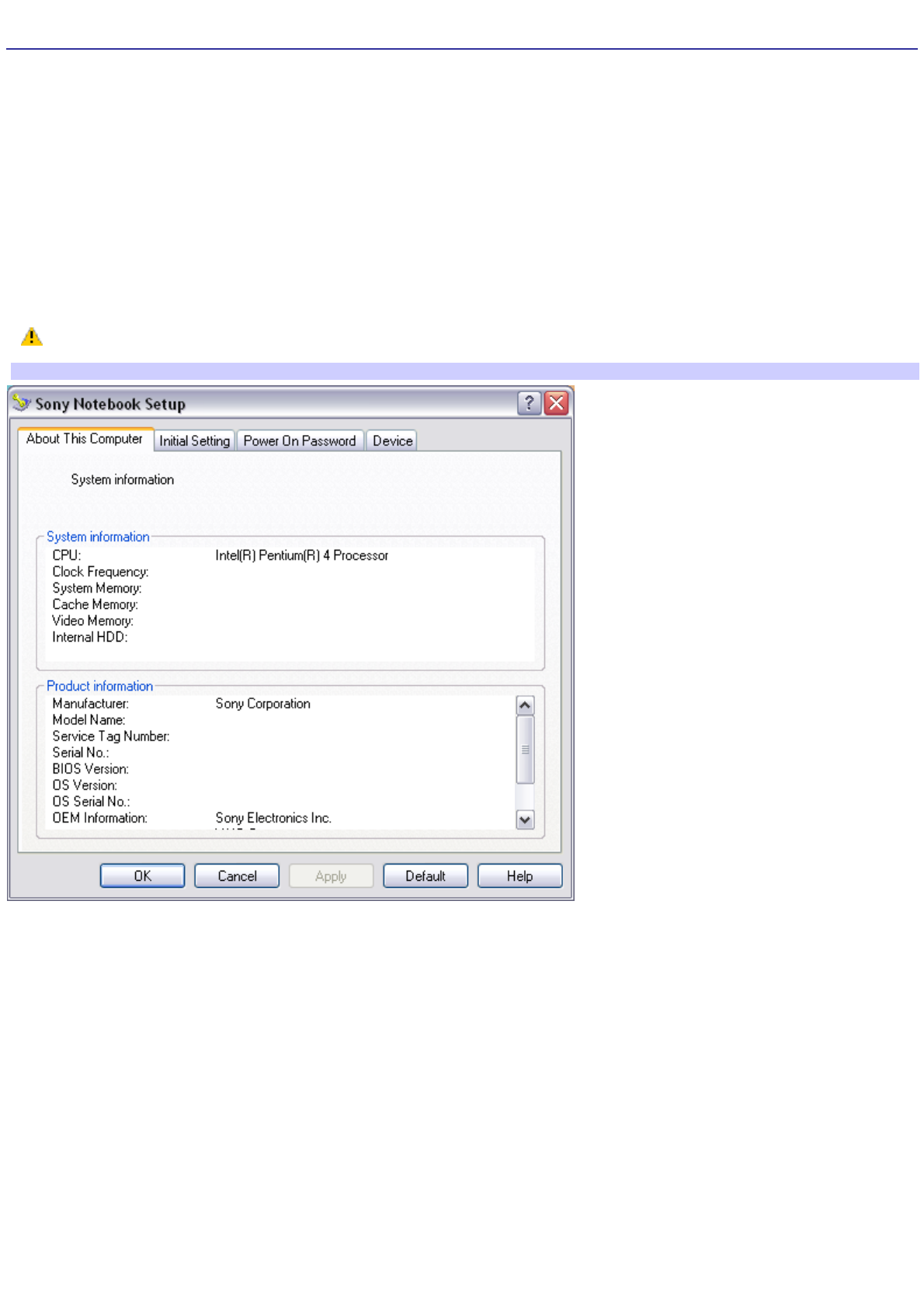 Default Values. The message Load default values for all SETUP items appears.