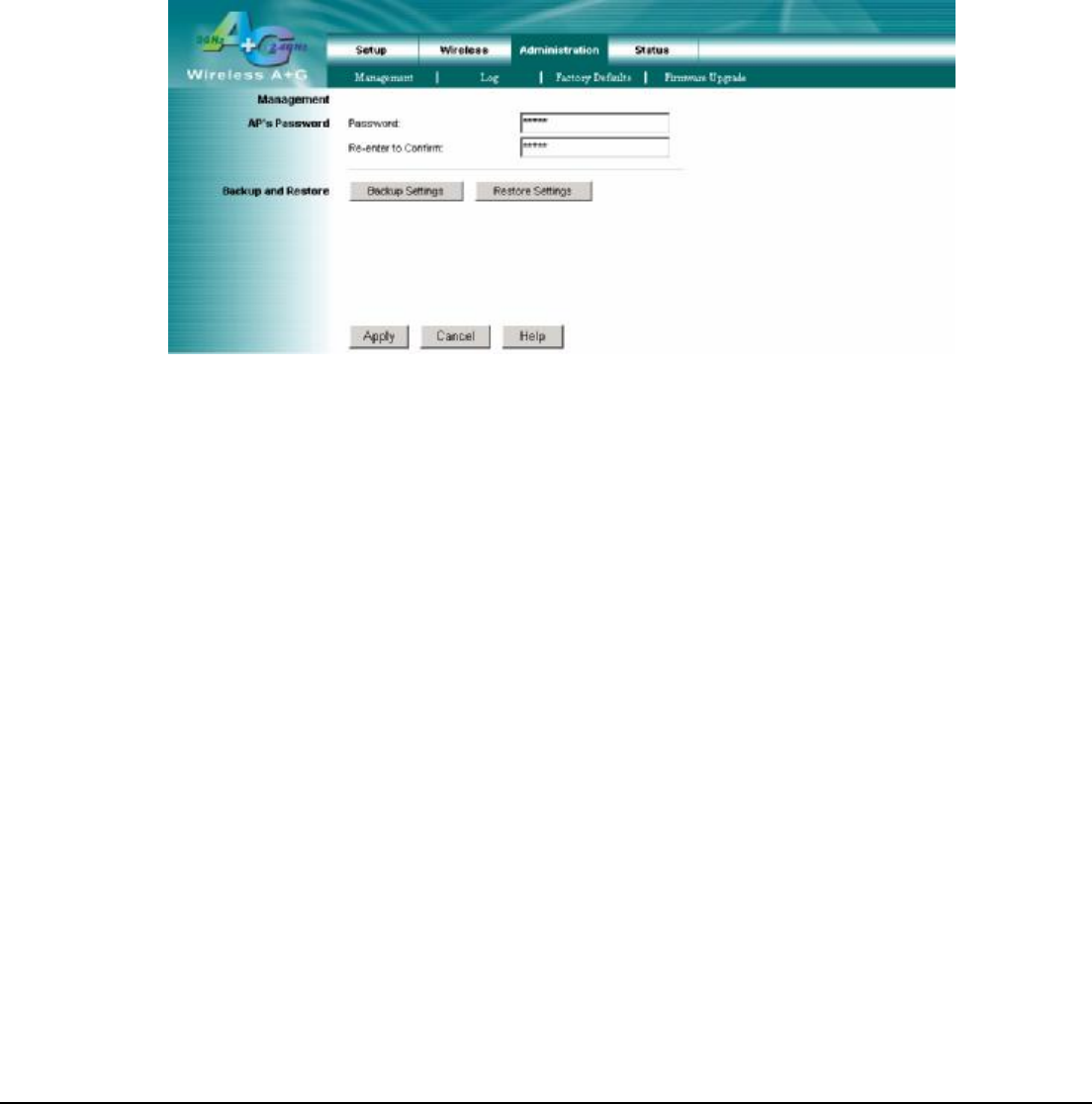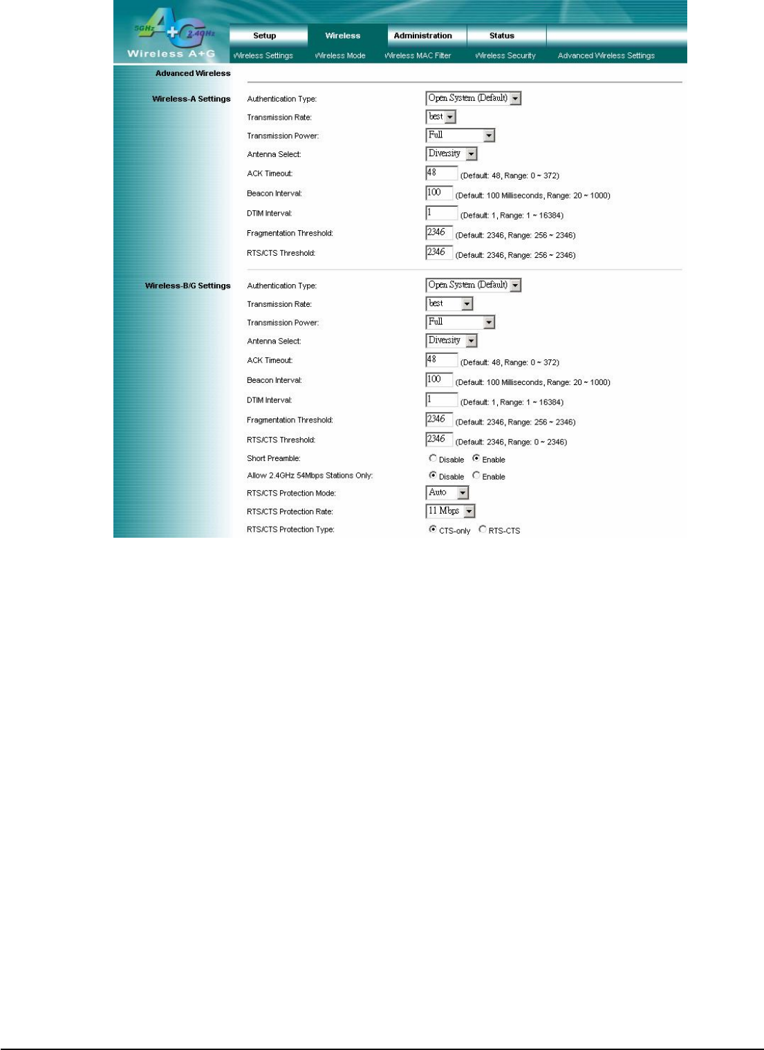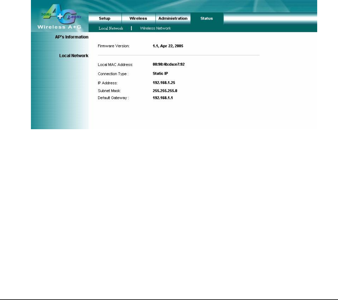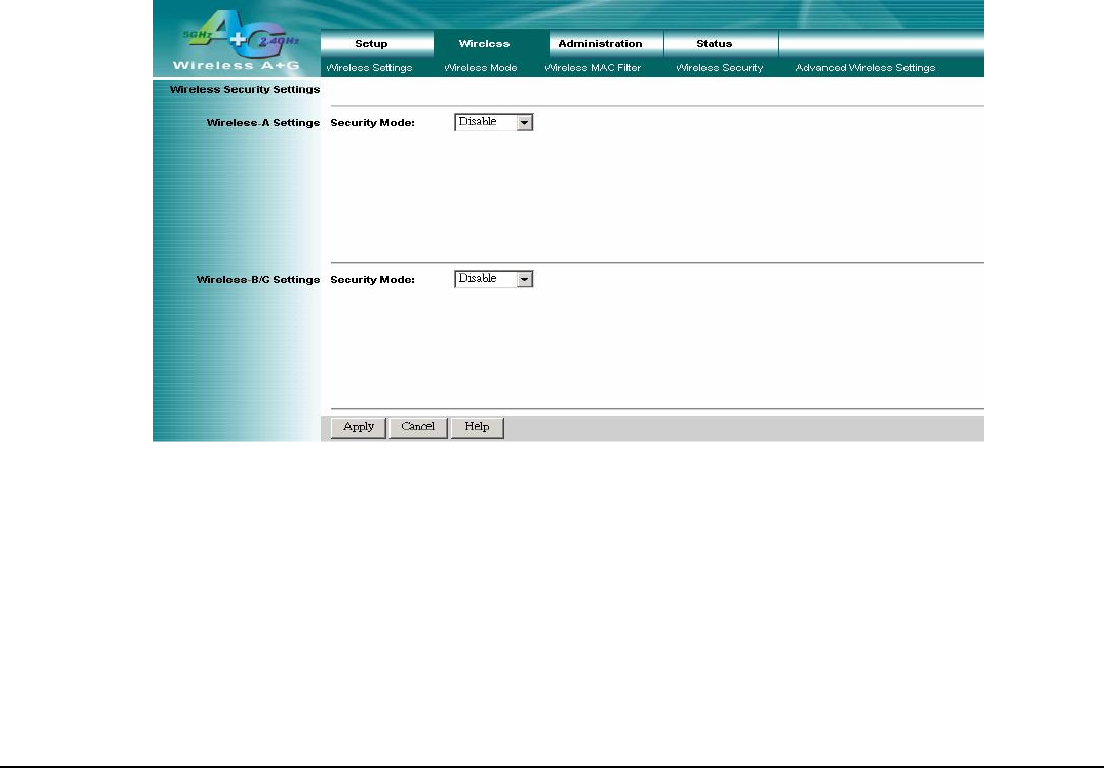 protection to the Wireless 11ag AP. The Security Settings section described later in this manual describes how to change