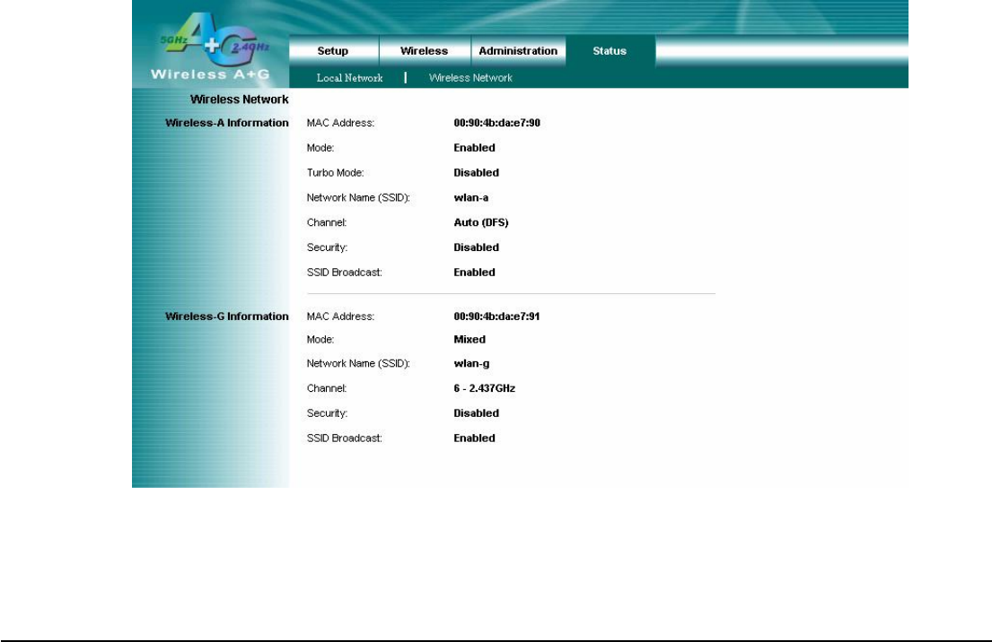The Wireless Network screen on the Status Tab displays the information of your Wireless networks.