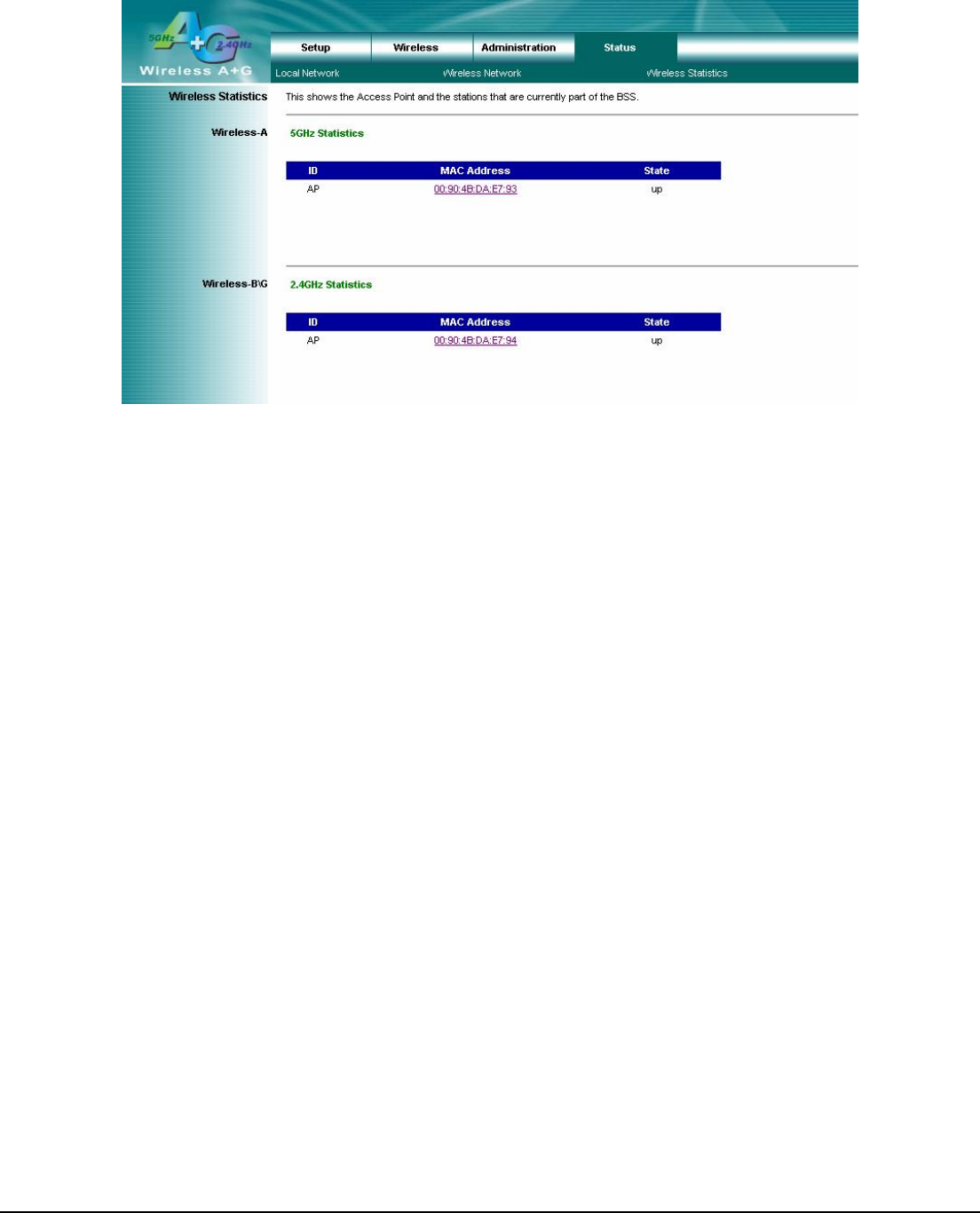 Wireless Statistics: This displays the AP and stations that are currently part of the BSS.