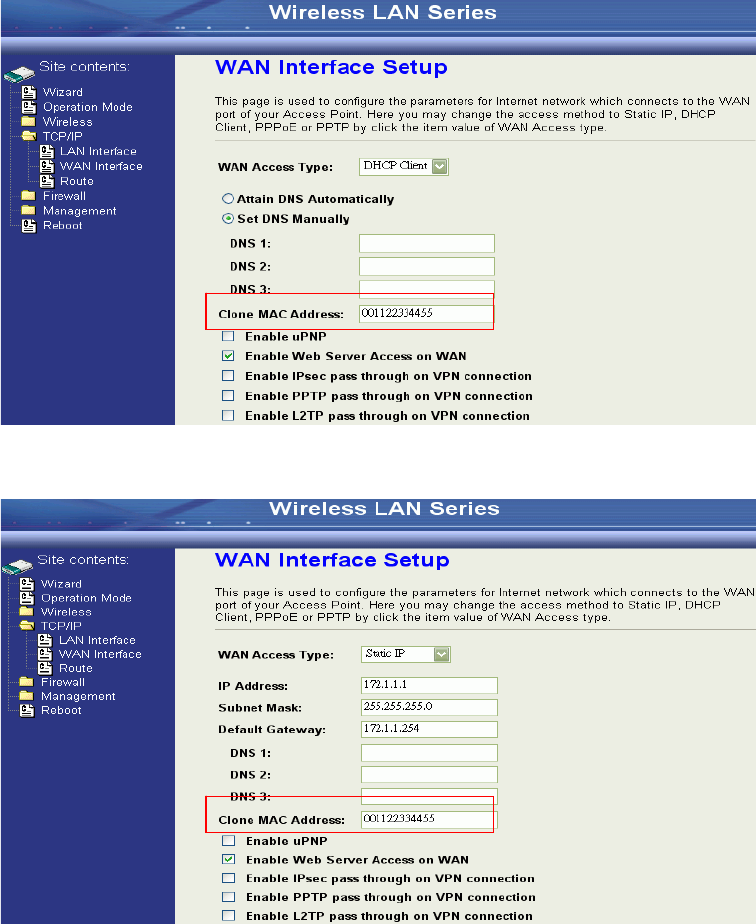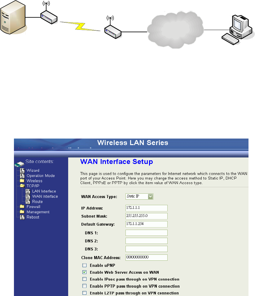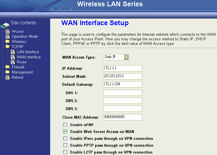 Types depend on your ISP required. The default WAN Access Type is “Static IP”.