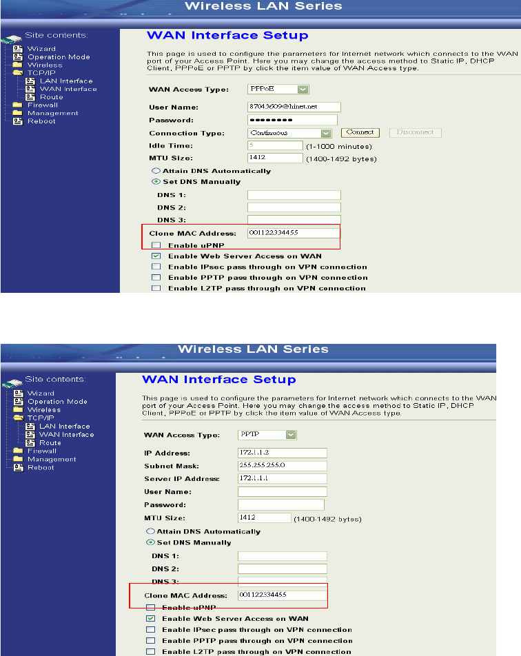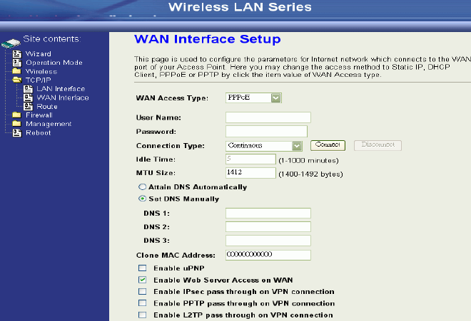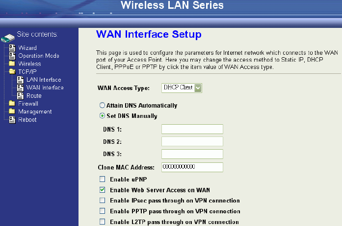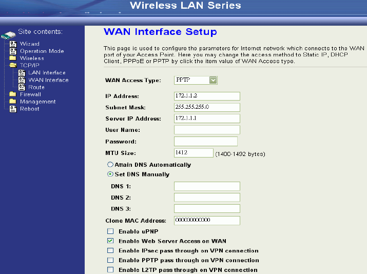 Static IP, DHCP Client, PPPoE and PPTP. You can select one of the WAN Access