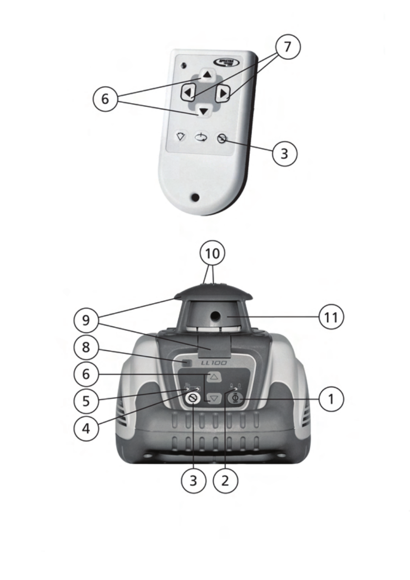 Note: The laser always powers up in the automatic self-leveling mode. The LEDs (2, 4 and 5) are