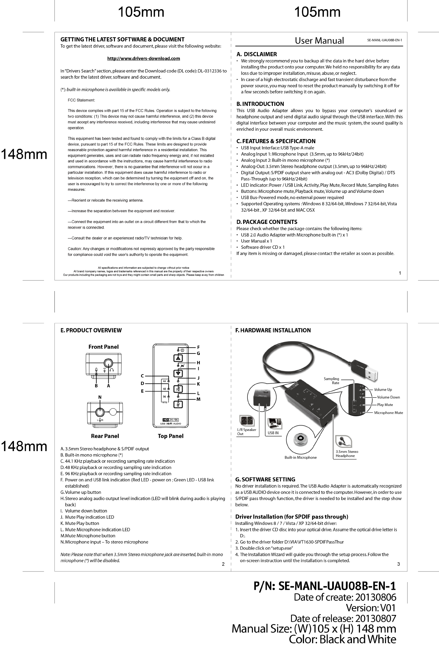 Speed Dragon Multimedia FG-UAU08B USB 2.0 96/24 audio DAC with Microphone built-in, VIA VT1630A User Manual Manual