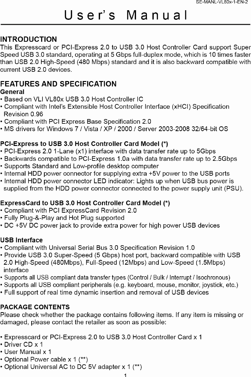 Speed Dragon Multimedia SPEED-EU303C PCI-Express 2.0 4-Port USB 3.0 User Manual