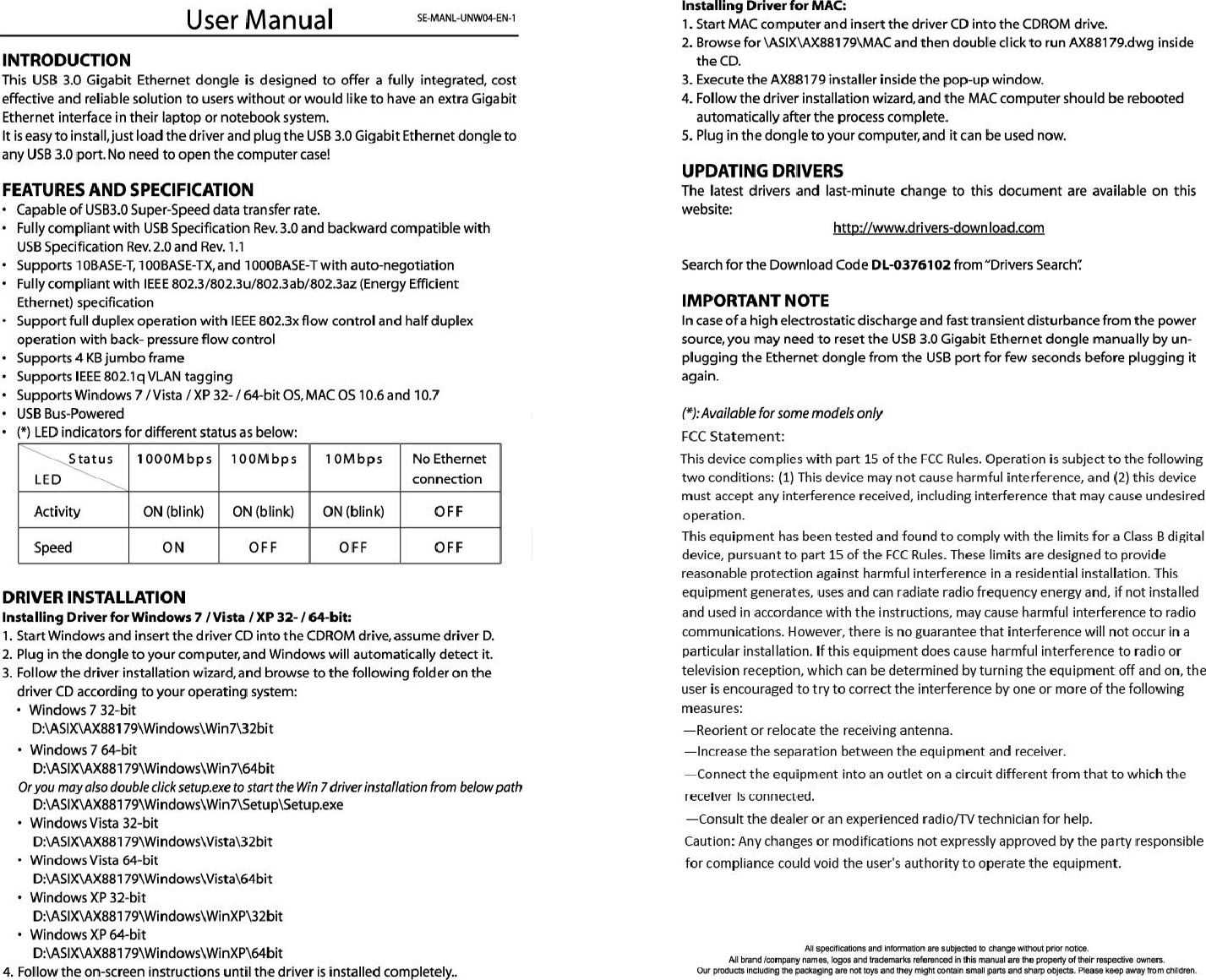 Speed Dragon Multimedia UNW07 USB 3.0 10/100/1000Mbps Gigabit Ethernet Dongle User Manual Full page photo
