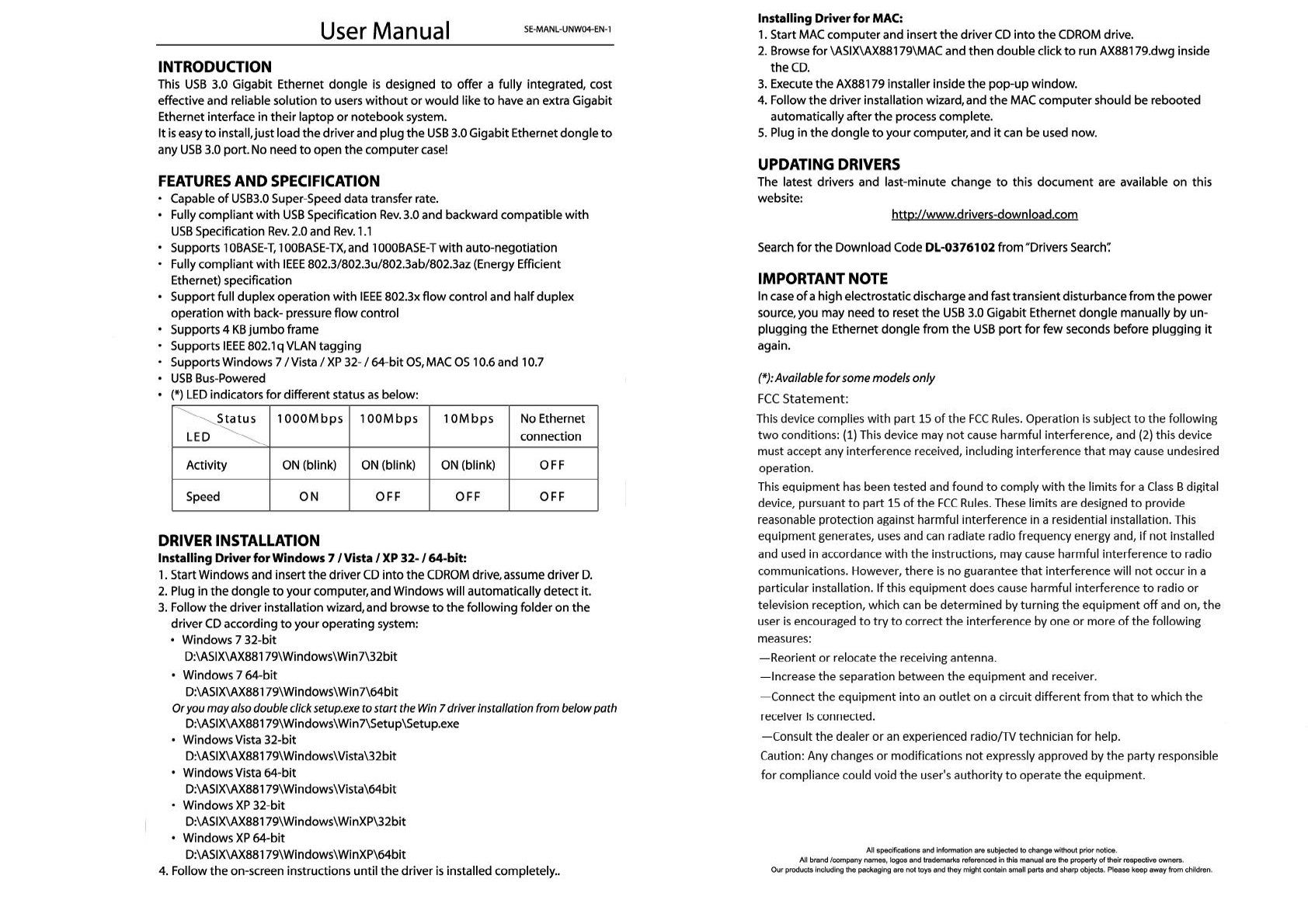 Speed Dragon Multimedia UNW07 USB 3.0 10/100/1000Mbps Gigabit Ethernet Dongle User Manual Full page photo