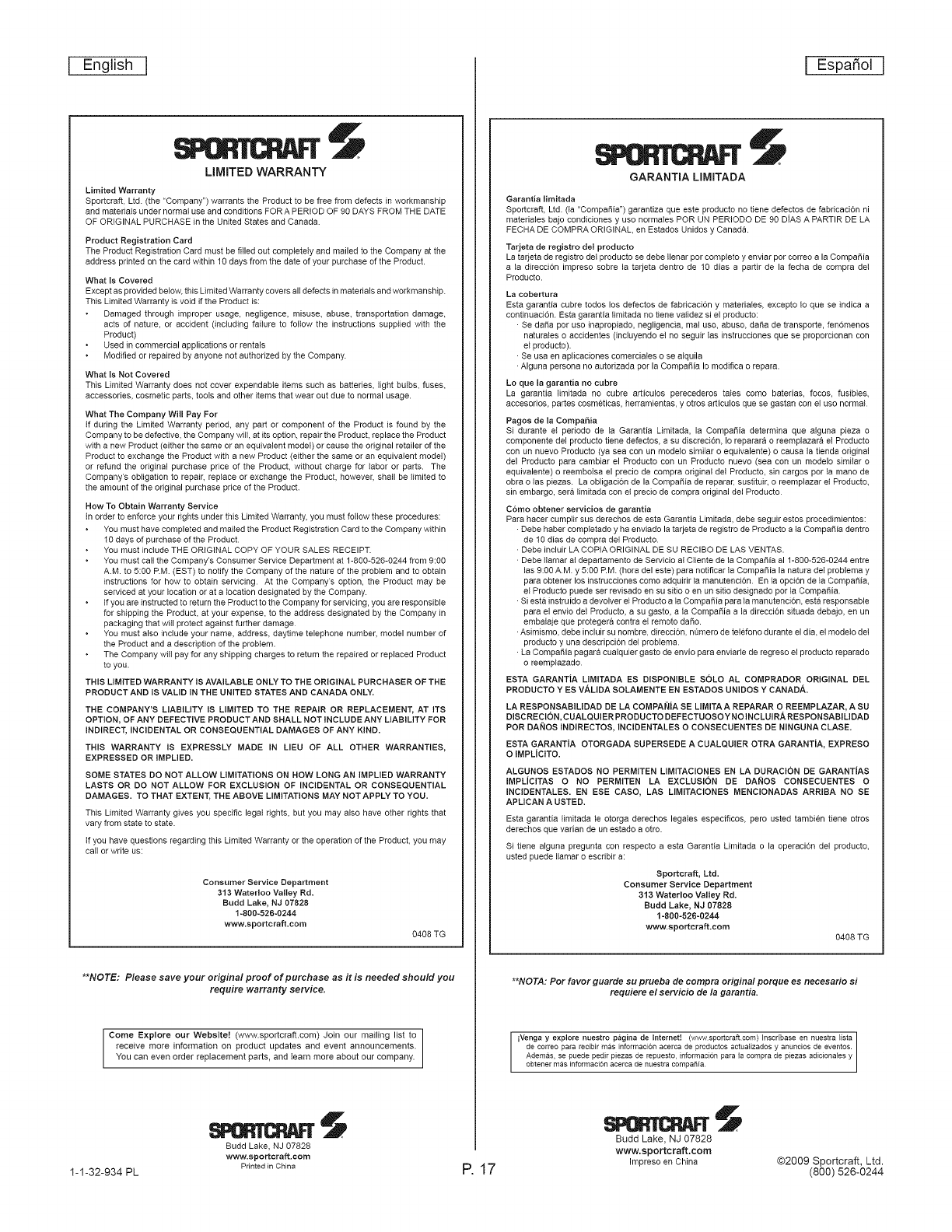 Soporte t_cnico: customerservice@sportcraft.com 1