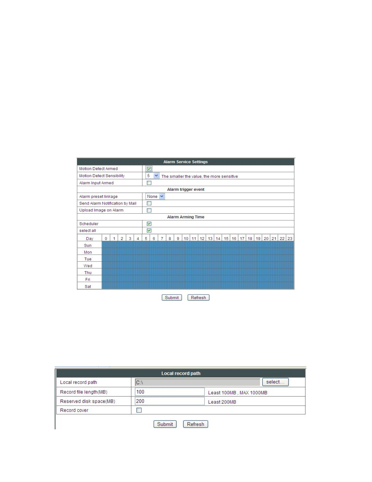 Path, Record file length(MB), Record time length(Minute), Reserved disk space(MB), Record