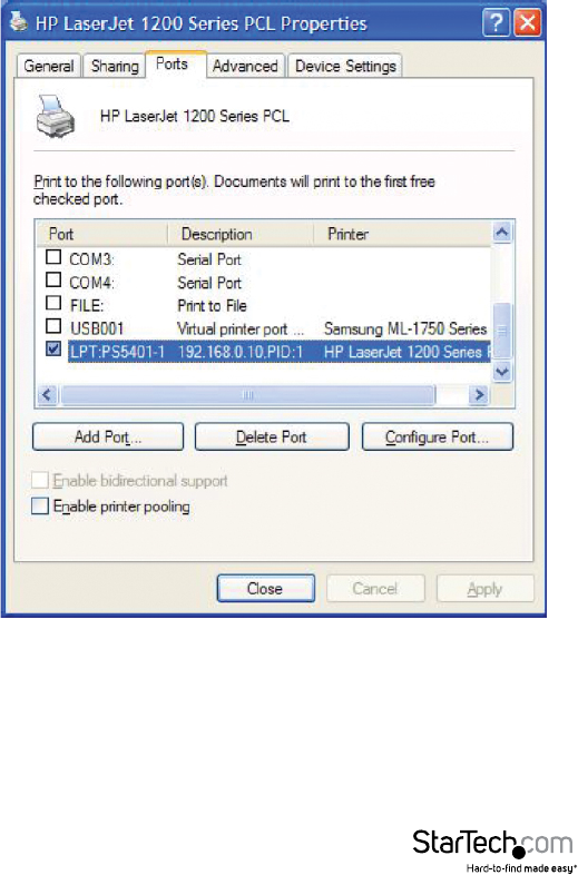 15. Right-click, select Properties, then the Ports tab and verify that the print server’s