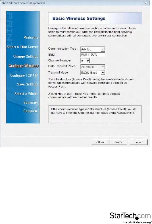 • If using Ad-Hoc mode, enter the SSID you would like the print server to display