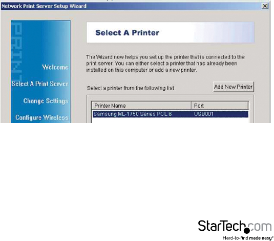 7. In the setup wizard, select an already congured printer from the list, click Next,