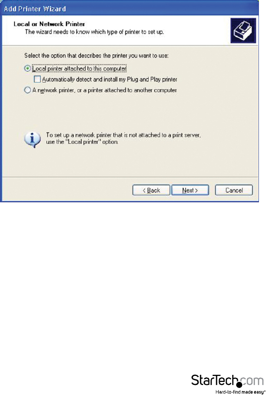 8. Click Next and select Local Printer, make sure the “Automatically detect and install