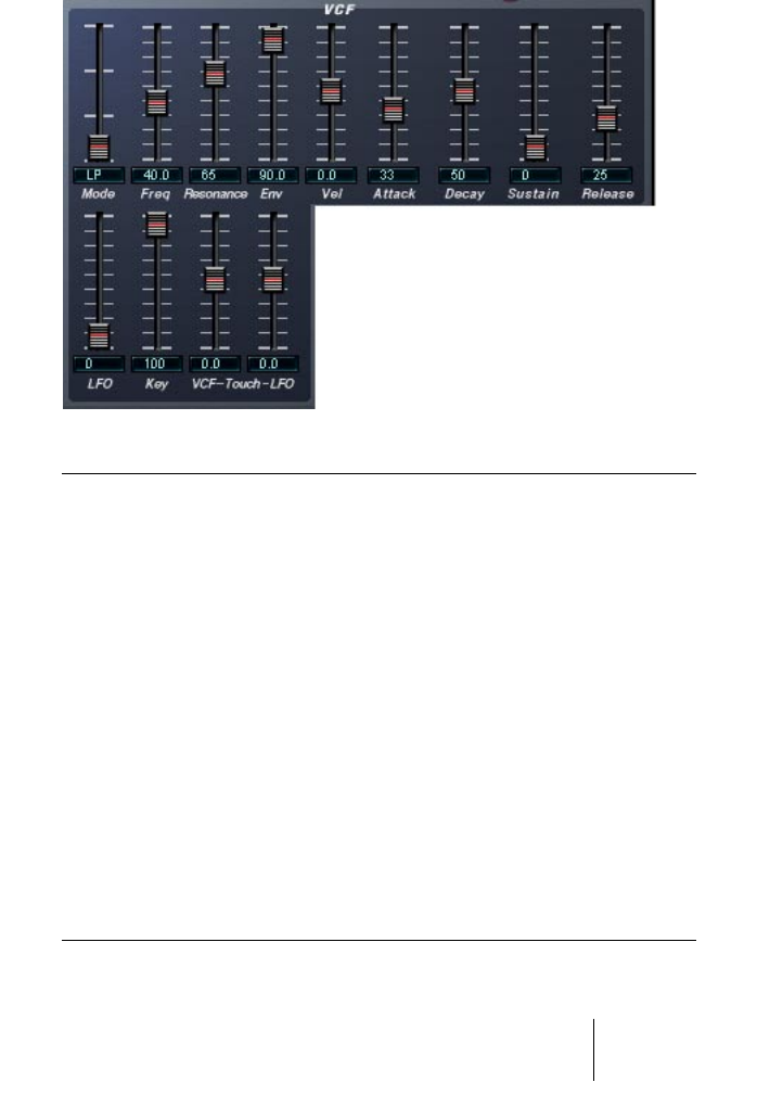VCF Resonance The Resonance control for the filter. Raise this for a more hol-
