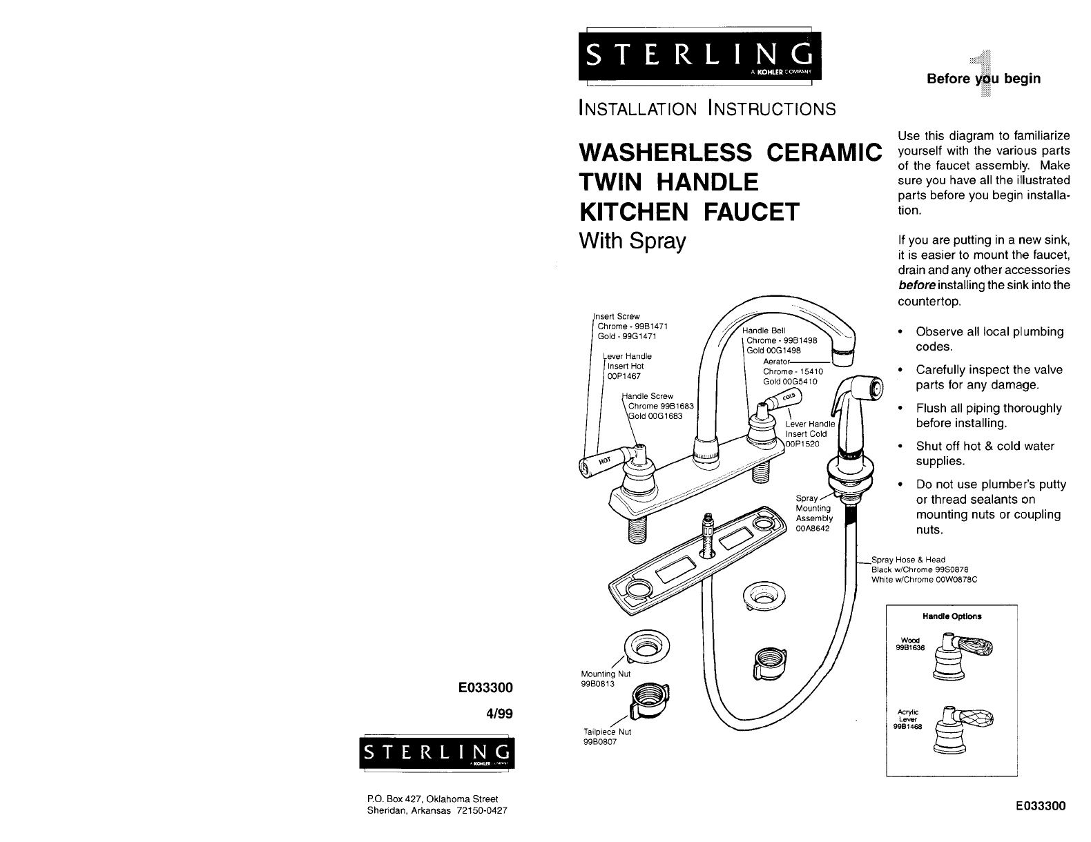 Sterling Plumbing E033300 Users Manual INSTALLATION INSTRUCTIONS FAUCET FI824S/C825S, WASHERLESS CERAMIC TWIN HANDLE KITCHEN WITH SPRAY