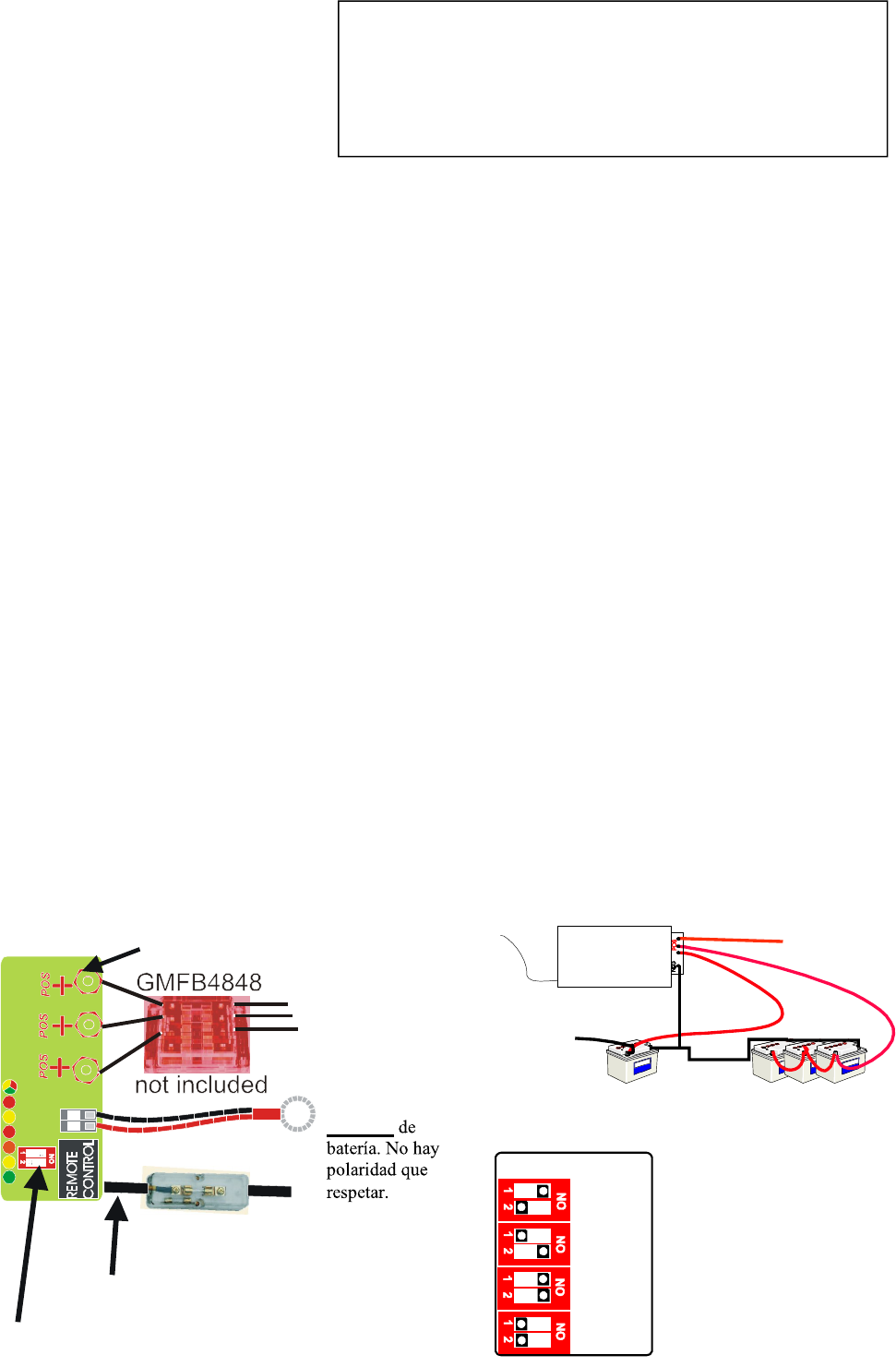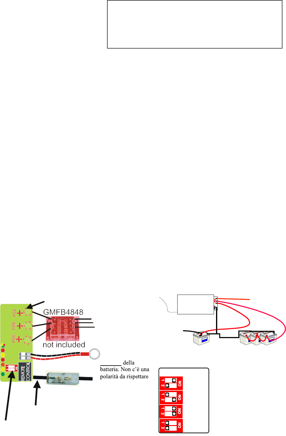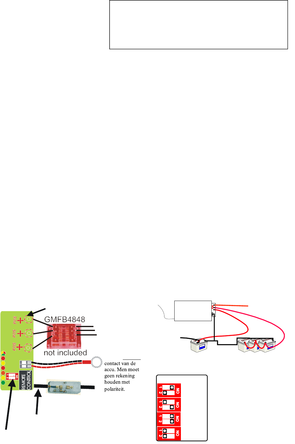 - Anslut kablarna som på nedanstående schema och se till att samtliga anslutningar används. Om endast ett batteri ska