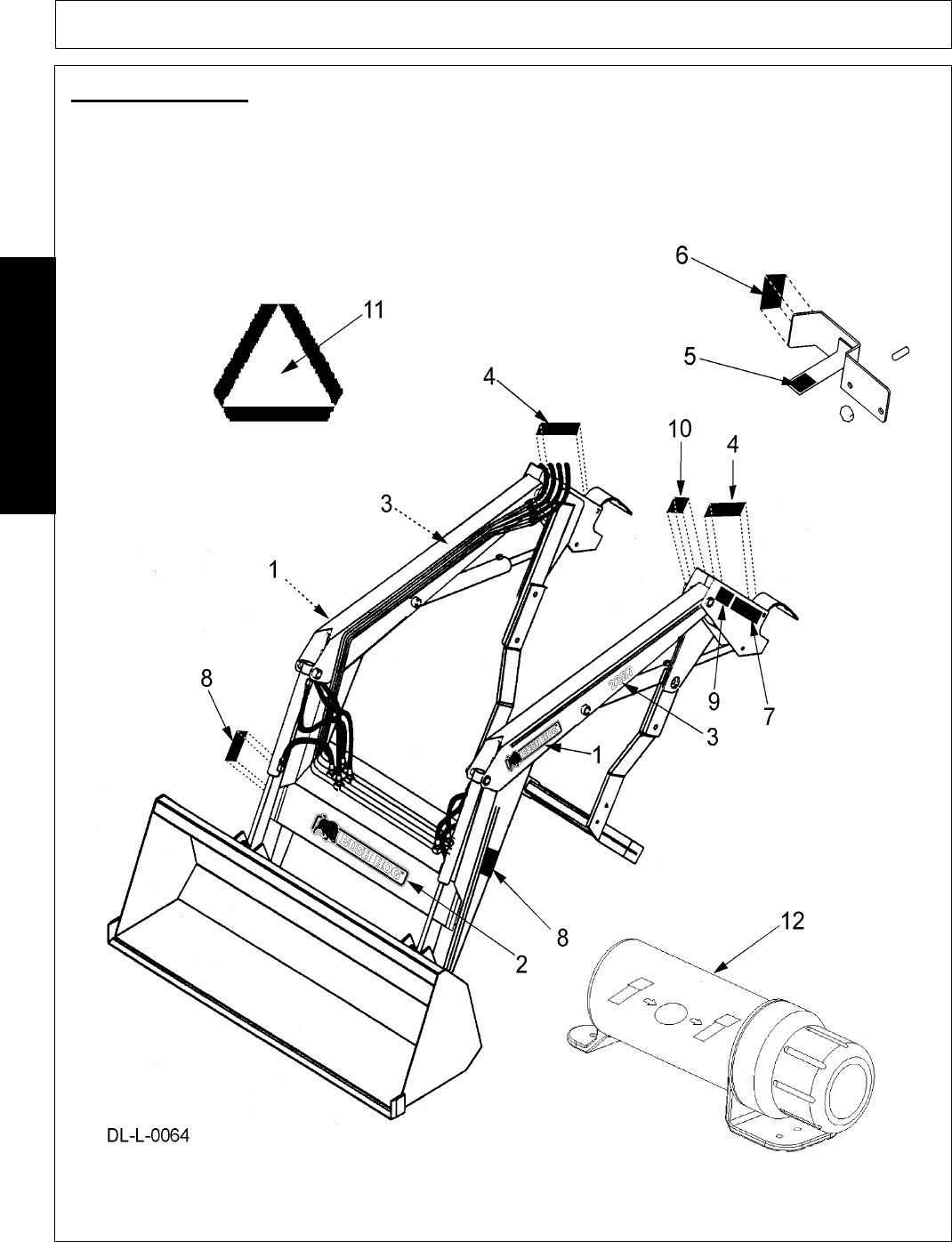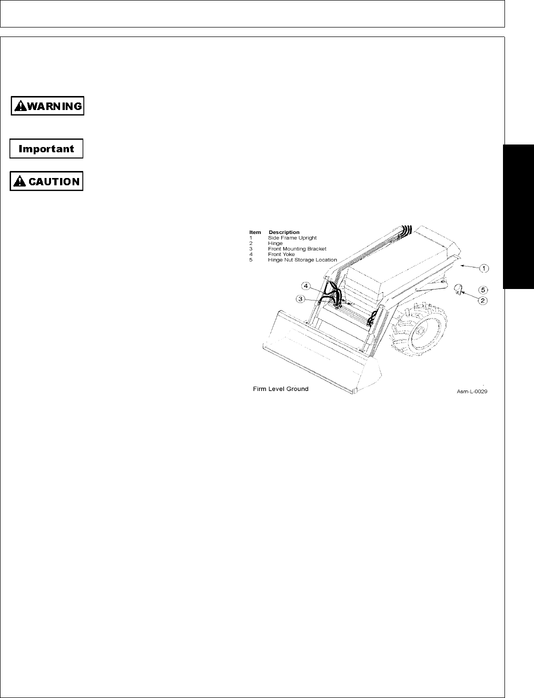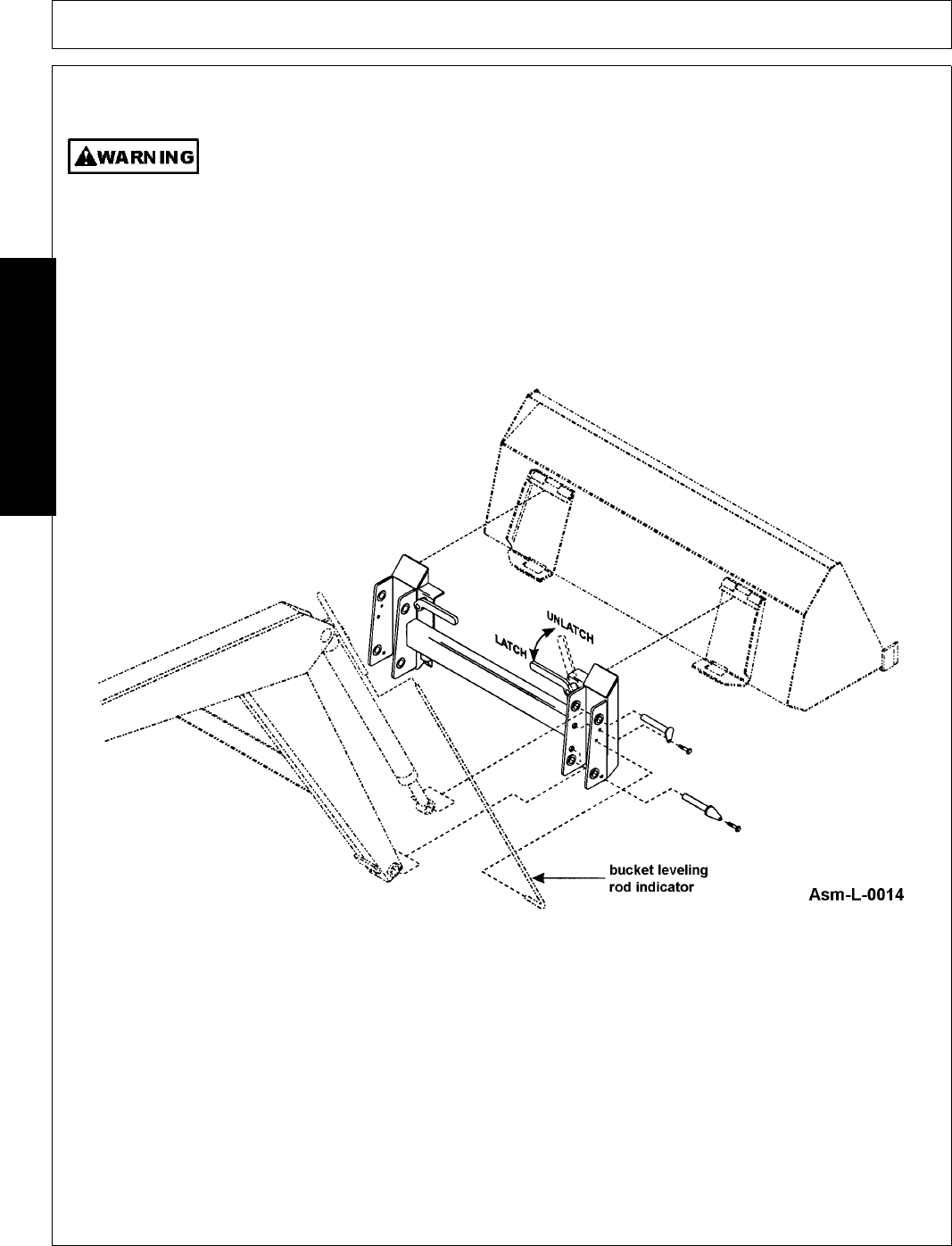 - 2. Attach bucket leveling rod indicator (supplied with loader), to outside of right ear on quick attach as shown. Figure Asm-L-0014. Secure bucket leveling rod indicator with two 1/8” x 1” cotter pins (supplied with loader).