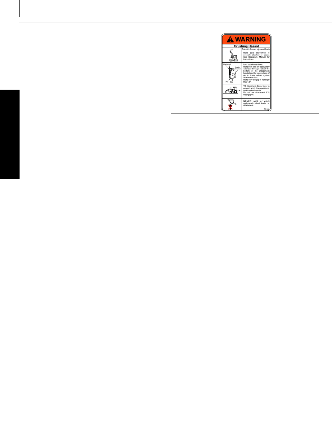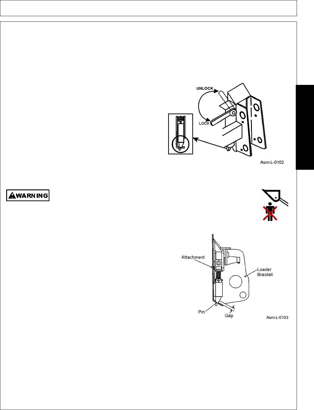 - 4. Raise the loader and attachment to shoulder height. By standing at the side of the loader, inspect the connection between the quick hitch and attachment.